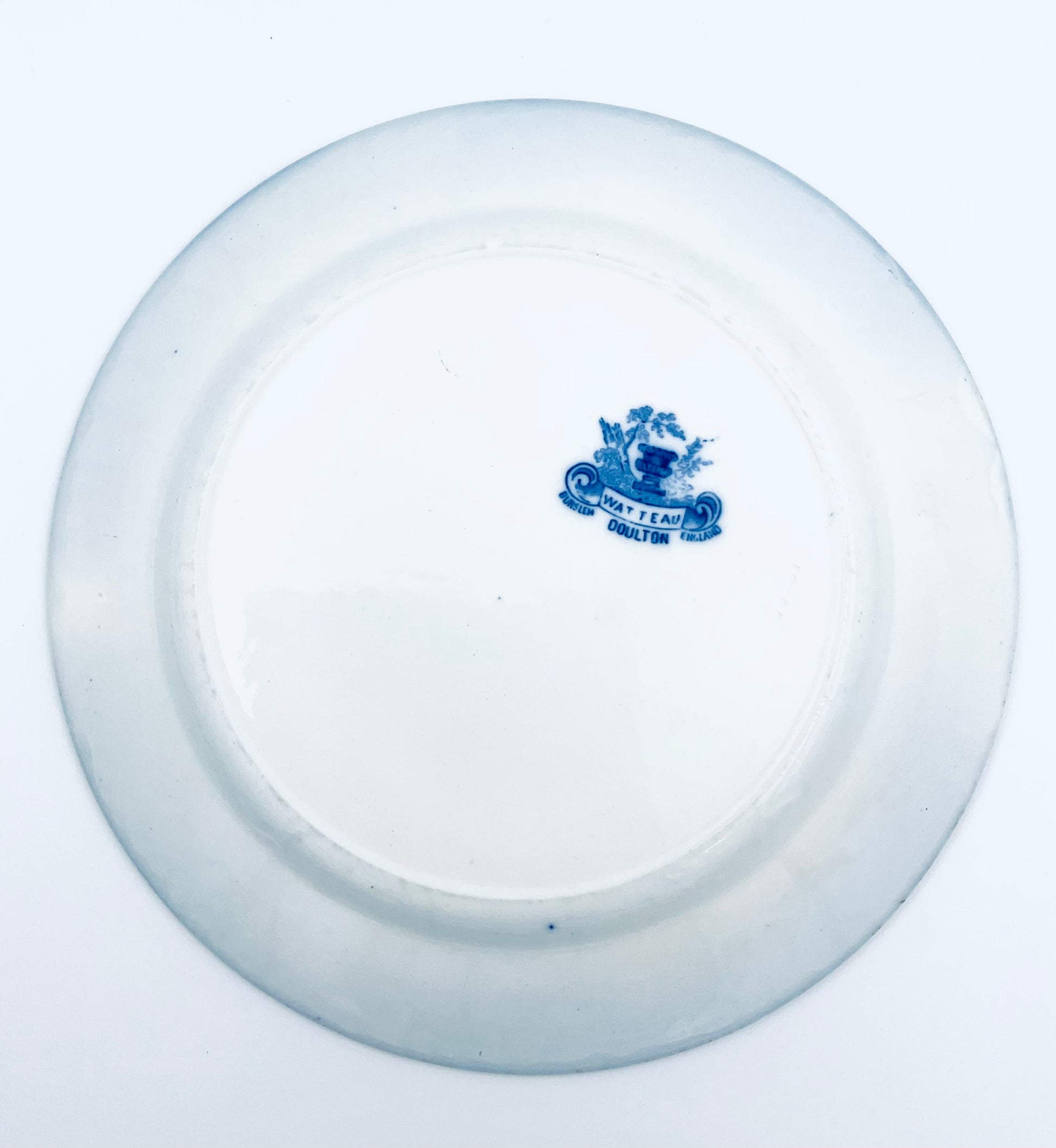 Antique Doulton Burslem plate featuring the ‘Watteau’ pattern. The ‘Watteau’ pattern is a type of “flow blue” china characterized by its blurred or flowing blue designs. Made in England it includes the Doulton Burslem crown mark dating it to the late 19th century.