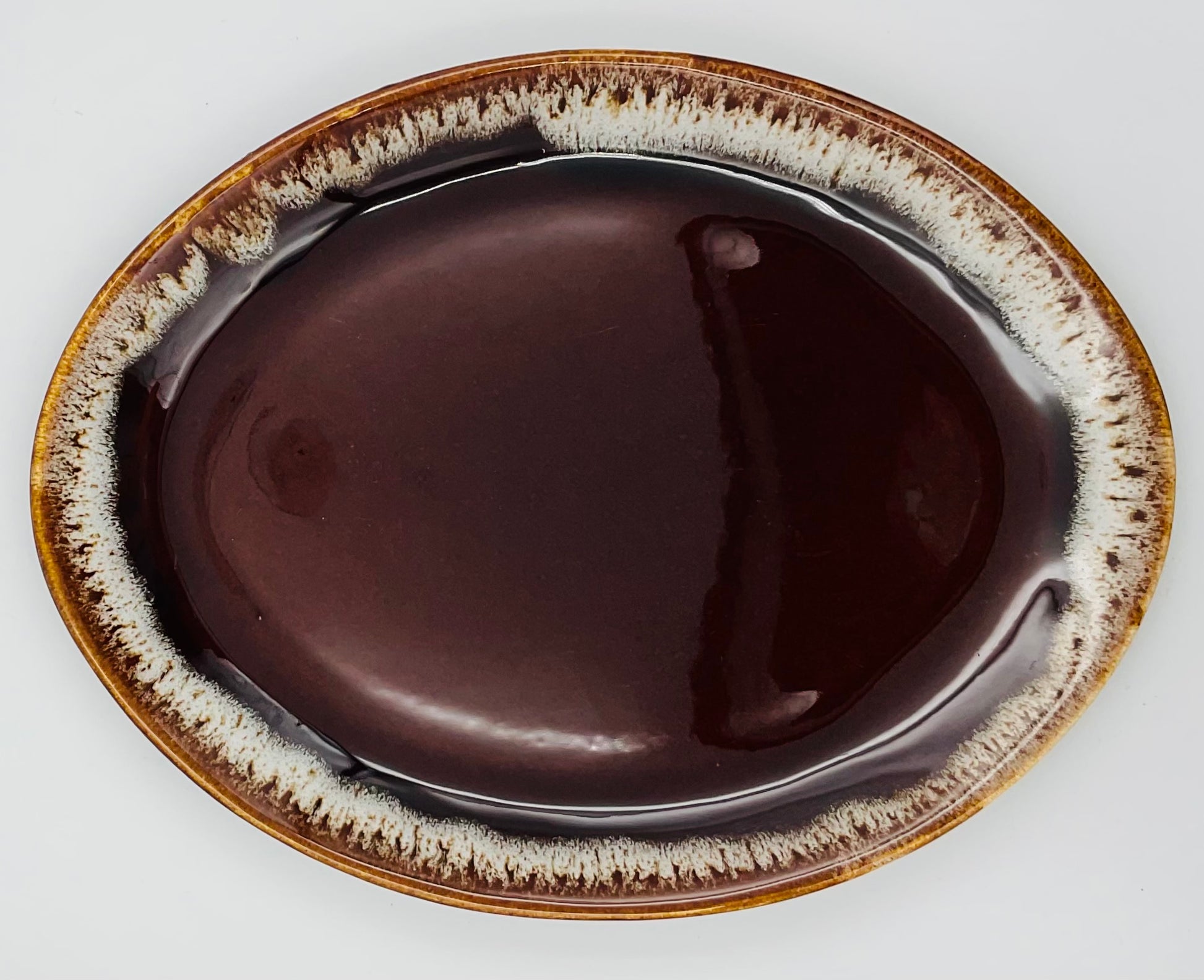Stunning vintage McCoy oval platter featuring the iconic brown drip glaze that made this American pottery so beloved. This large serving piece showcases the beautiful organic drip pattern with warm amber and cream tones along the rim, transitioning to a rich chocolate brown center.