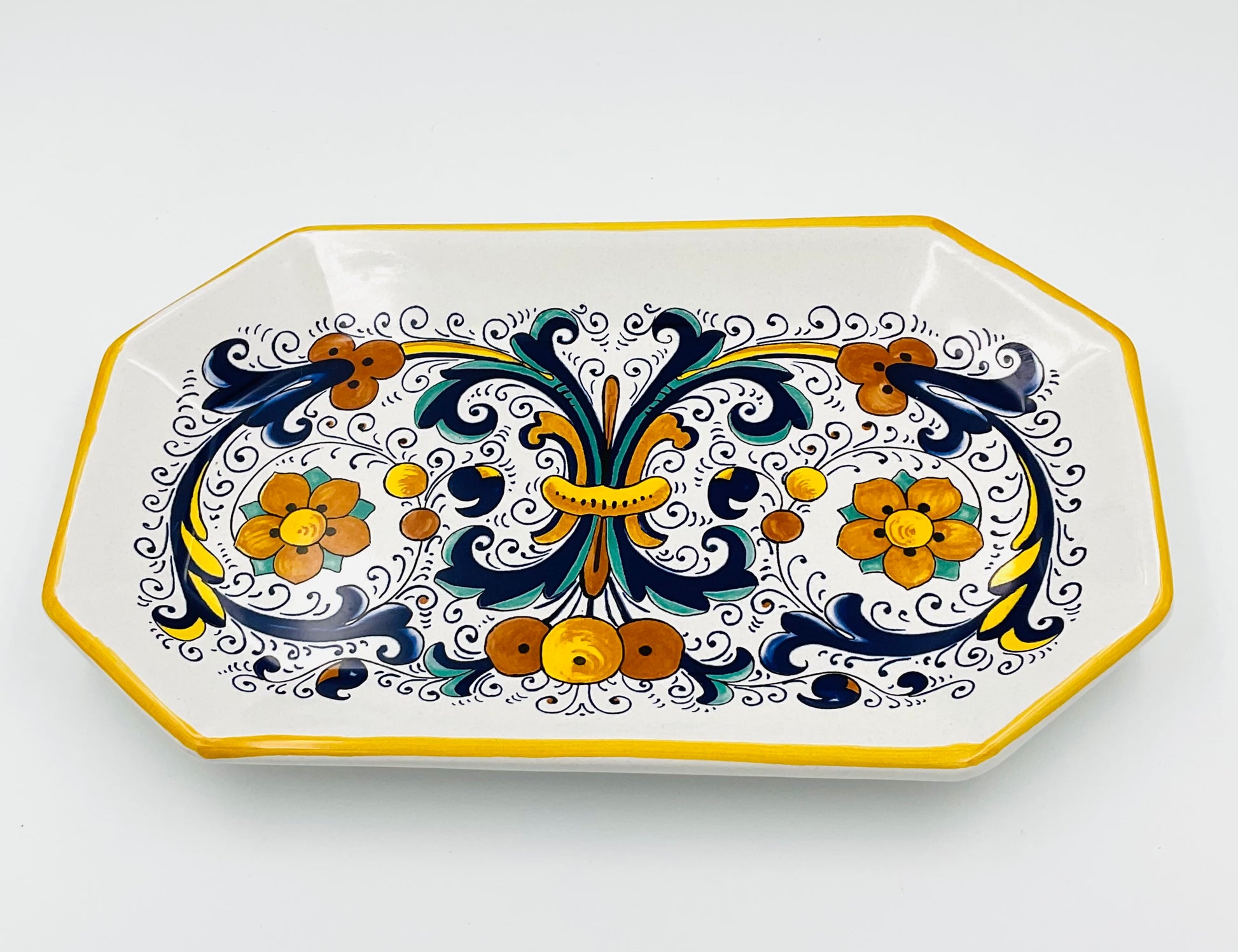 Handcrafted in Deruta, Italy, this majolica serving platter showcases the region's centuries-old ceramic tradition. Each piece features vibrant hand-painted detailing with the distinctive glazed finish characteristic of Nova Deruta pottery. The generous surface accommodates appetizers, cheeses, or desserts while serving as a striking table centerpiece. Durable earthenware construction withstands regular use, and the artisanal quality ensures no two pieces are identical. A timeless addition to curated tableware collections and a conversation-starting accent for entertaining