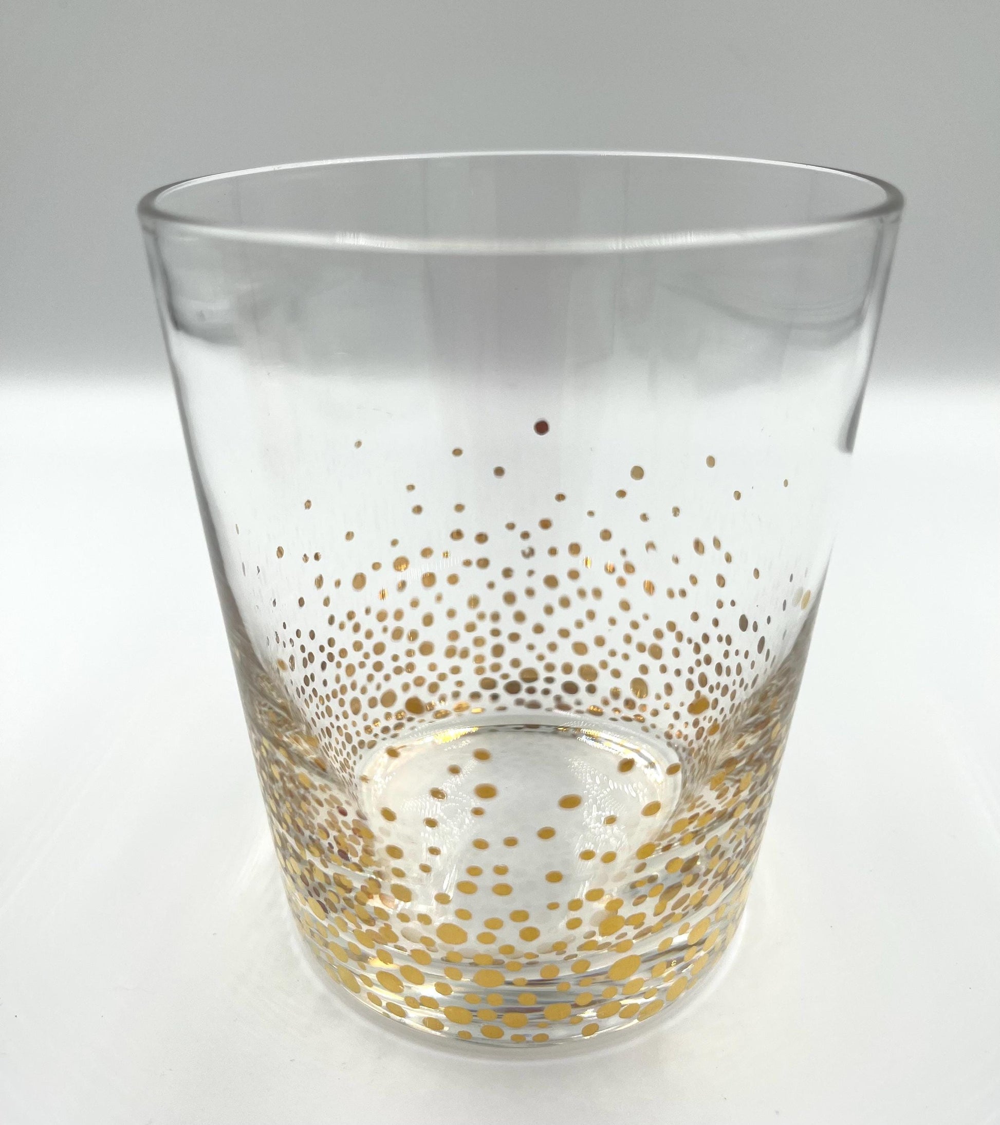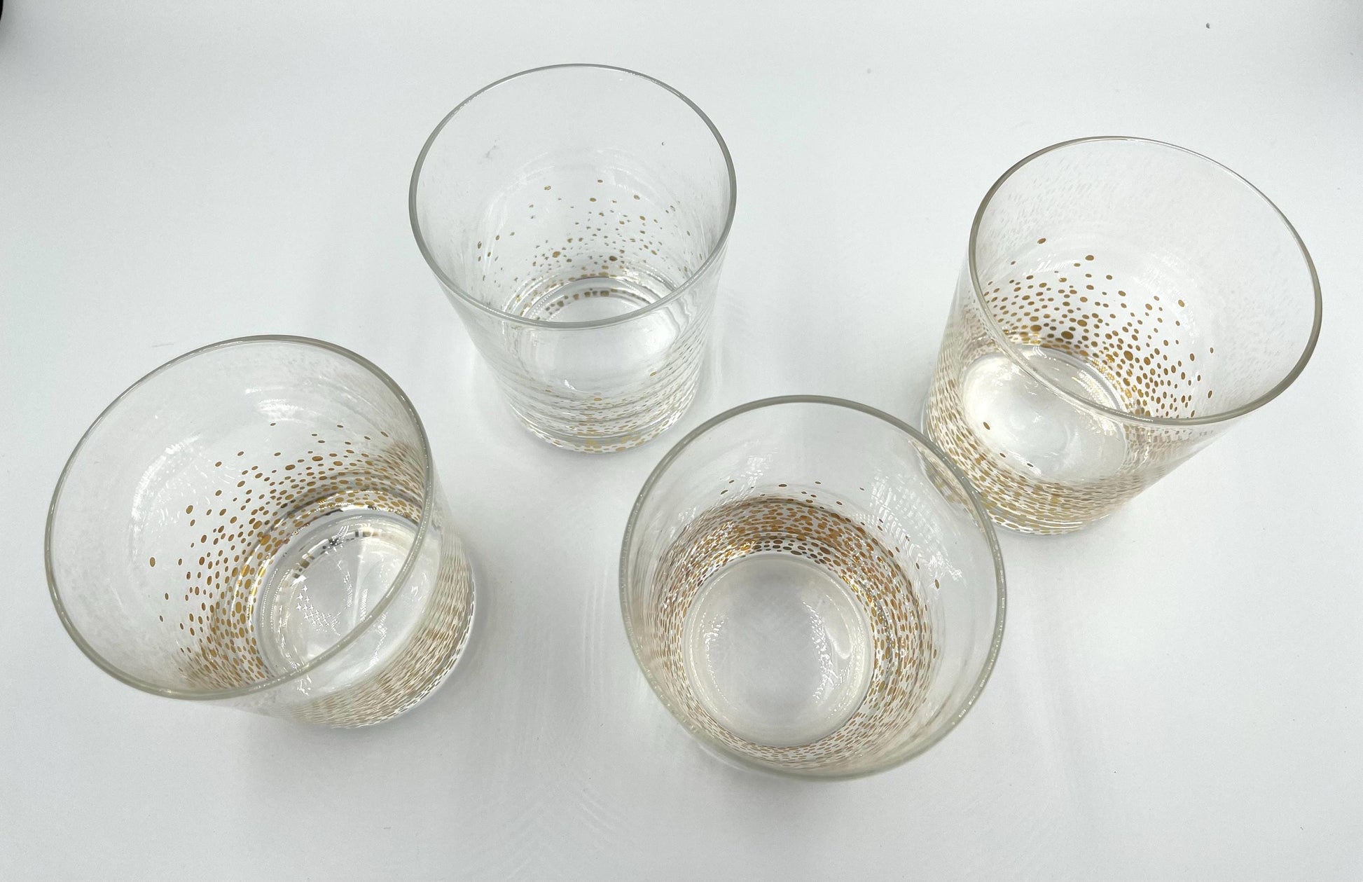 Set of four, double old fashioned gold dot confetti glasses. All are in used, good condition - one glass has some dots that have been worn or washed off (please see photos)