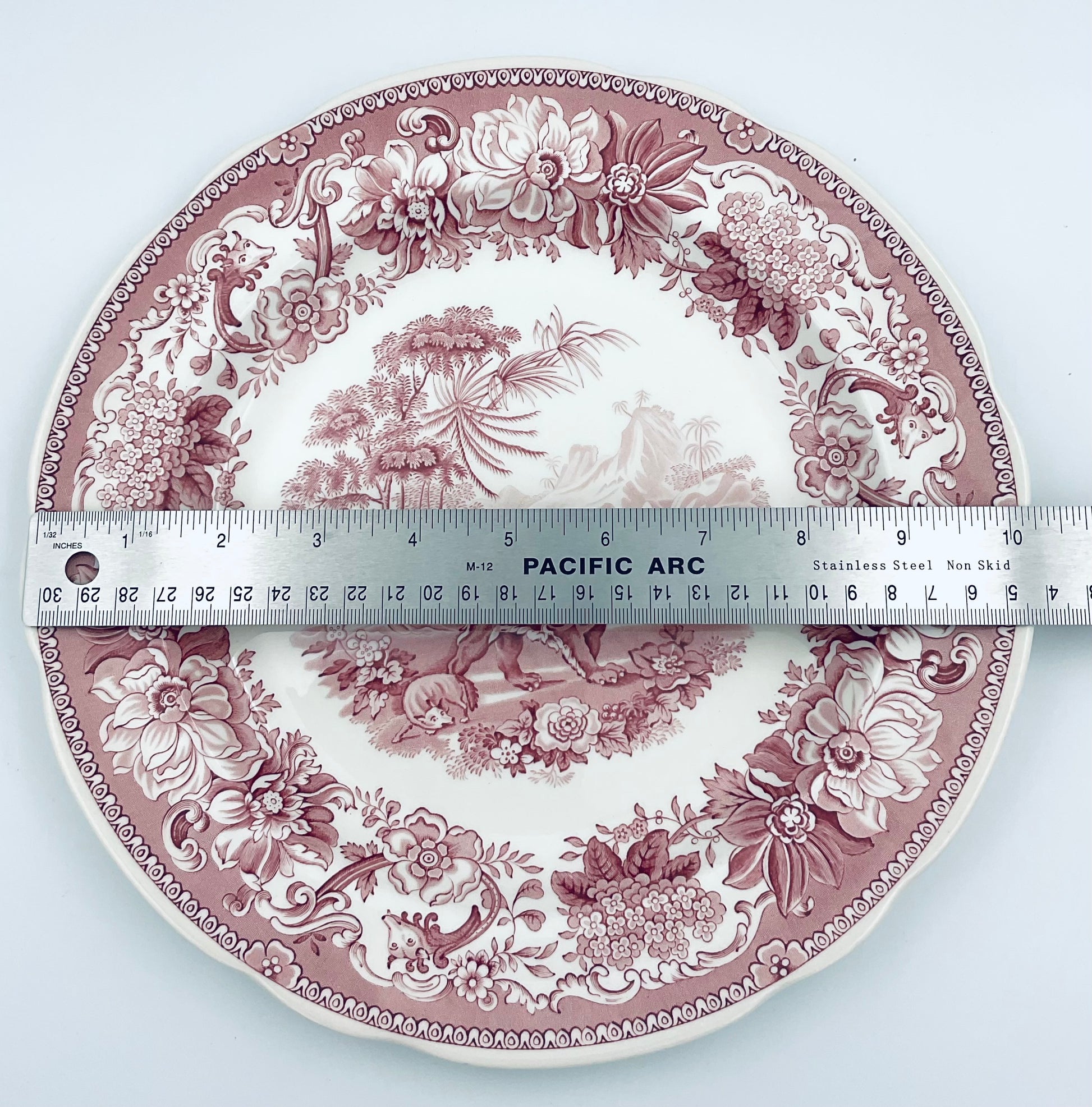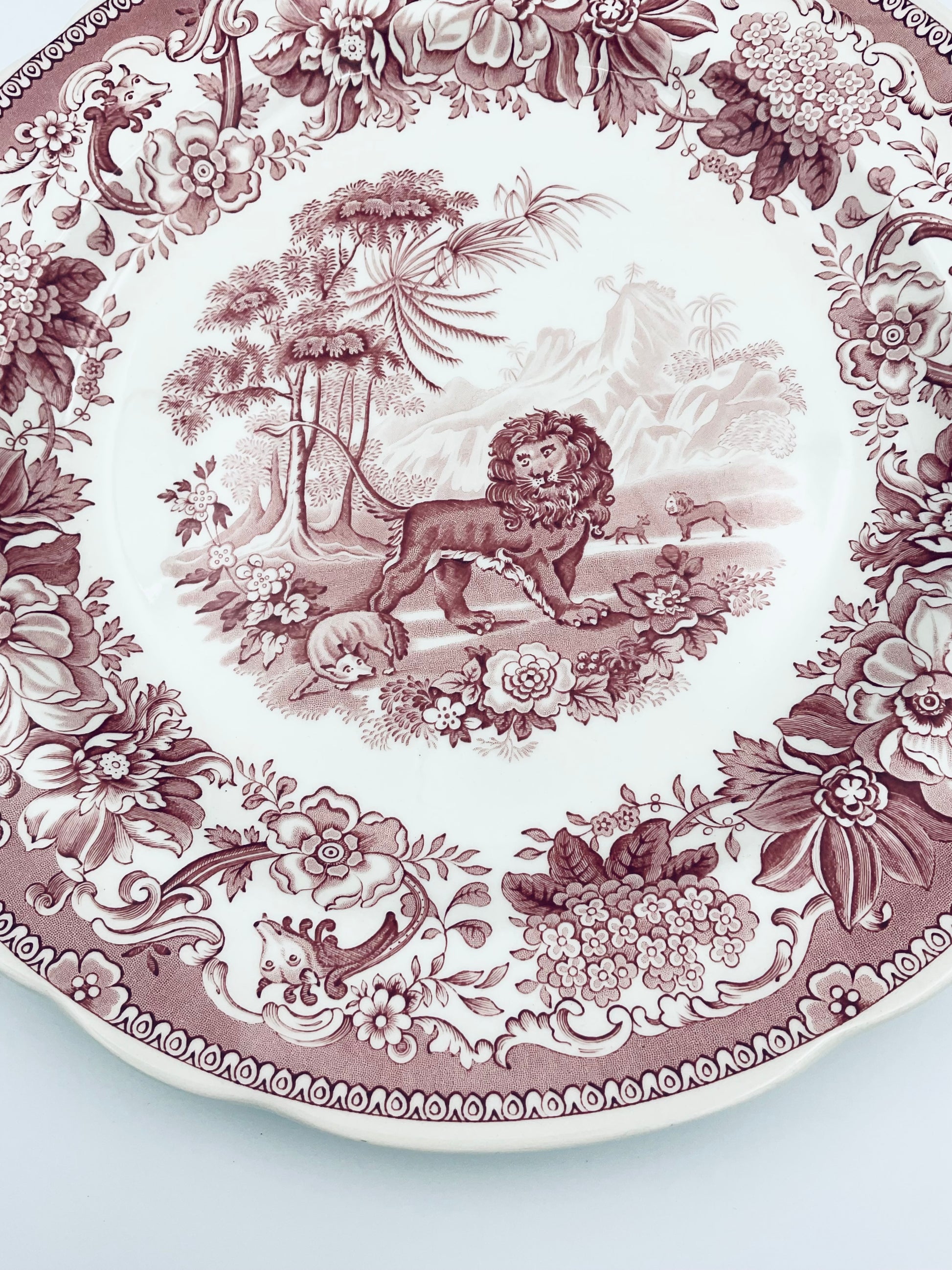 Spode Archive Collection dinner plate, featuring the Aesop’s Fables Pattern. Made of fine Earthenware it is approx. 10.5” in diameter and features a cranberry-red transferware design. The plate is part of the Traditions Series, originally produced from hand engraved copper plates.