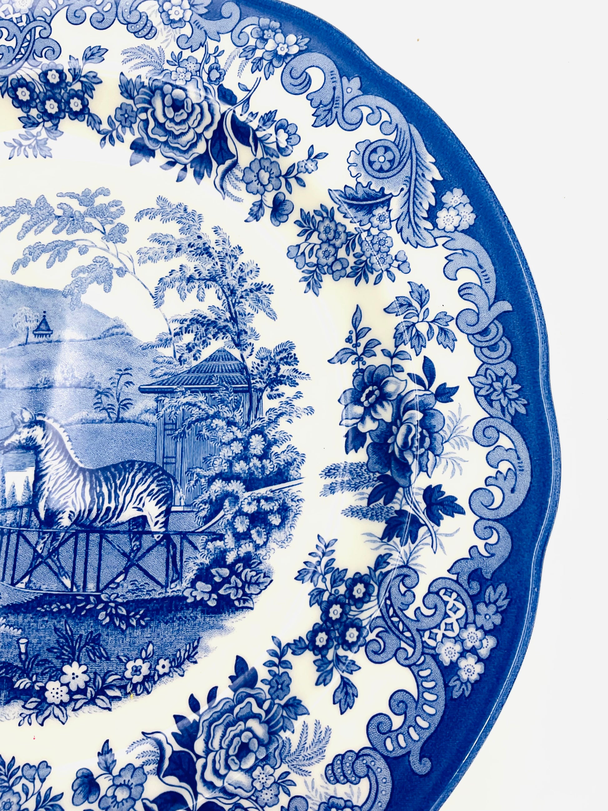 Spode Blue Room Collection dinner plate, featuring the Zebra Pen design which is part of the Zoological Collection (please see additional listings). Made of fine Earthenware it is approx. 10.5” in diameter. The Zoological Collection is part of Spode’s original 19th century production and was named after a display room at the original Spode factory that showcased a variety of historic blue and white transferware designs. Originally produced from hand engraved copper plates.