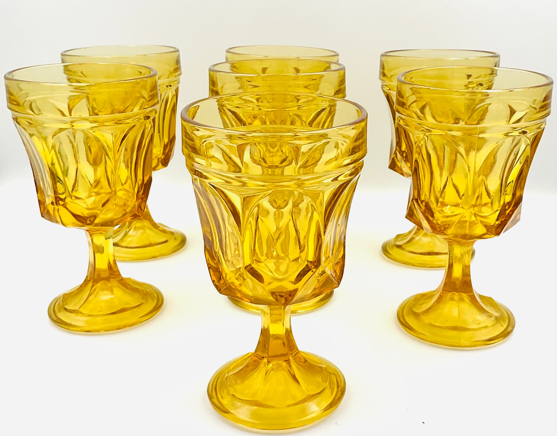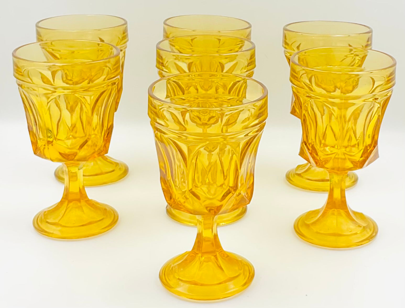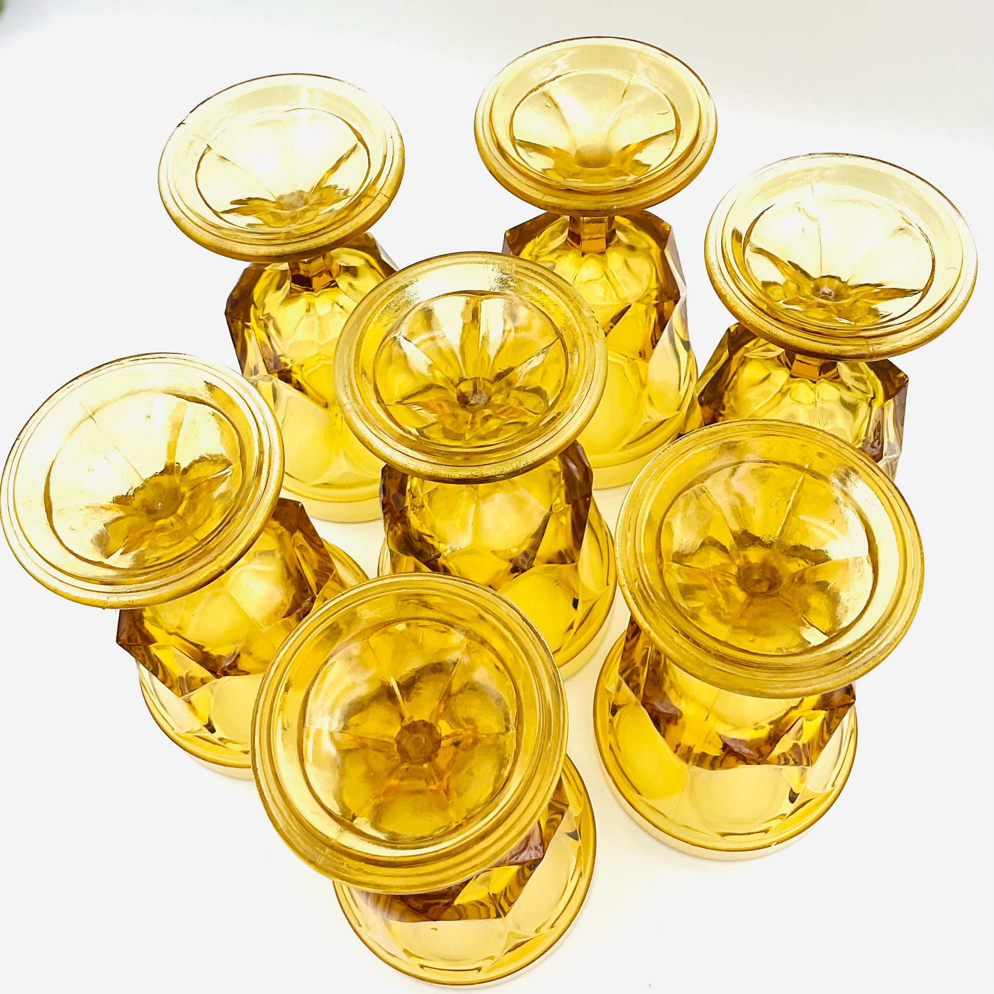 These Vintage Anchor Hocking Fairfield Amber Footed Goblets are made in the United States with a pressed glass technique, these original goblets feature an elegant design and are part of the Fairfield product line. With a vintage American theme and a beautiful amber color, these goblets are a timeless addition to any home bar or table setting. The footed design adds an extra touch of sophistication to these classic drinkware pieces.