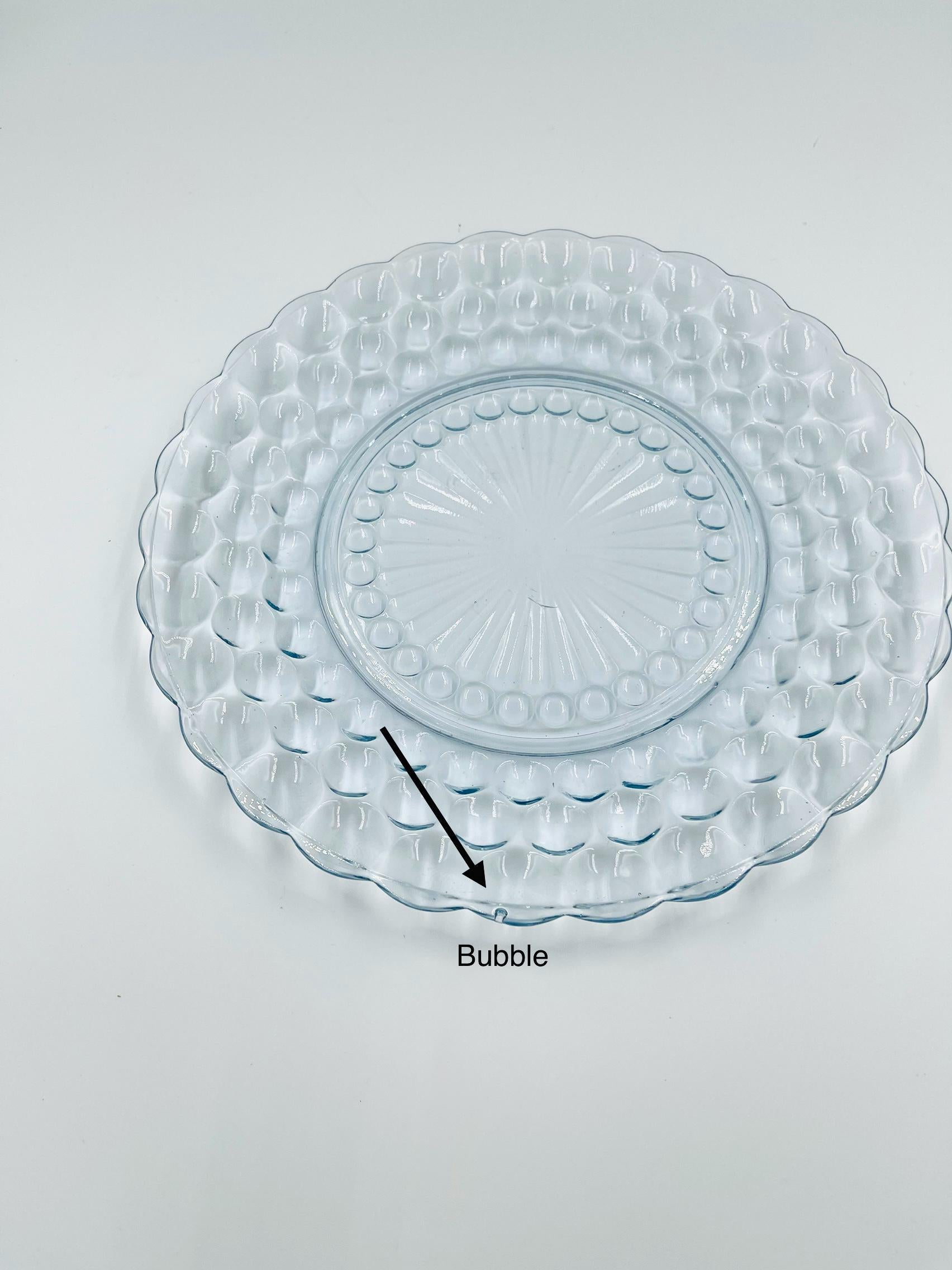 The Vintage Light Blue Bubble Dessert Plate by Anchor Hocking is a round glass plate featuring a bubble pattern in a light blue color. This nostalgic piece is part of the Bubble product line, making it a unique addition to any collection of decorative cookware or serveware. Its vintage design adds a touch of charm and elegance to any table setting, perfect for serving desserts or snacks in a stylish and timeless manner.