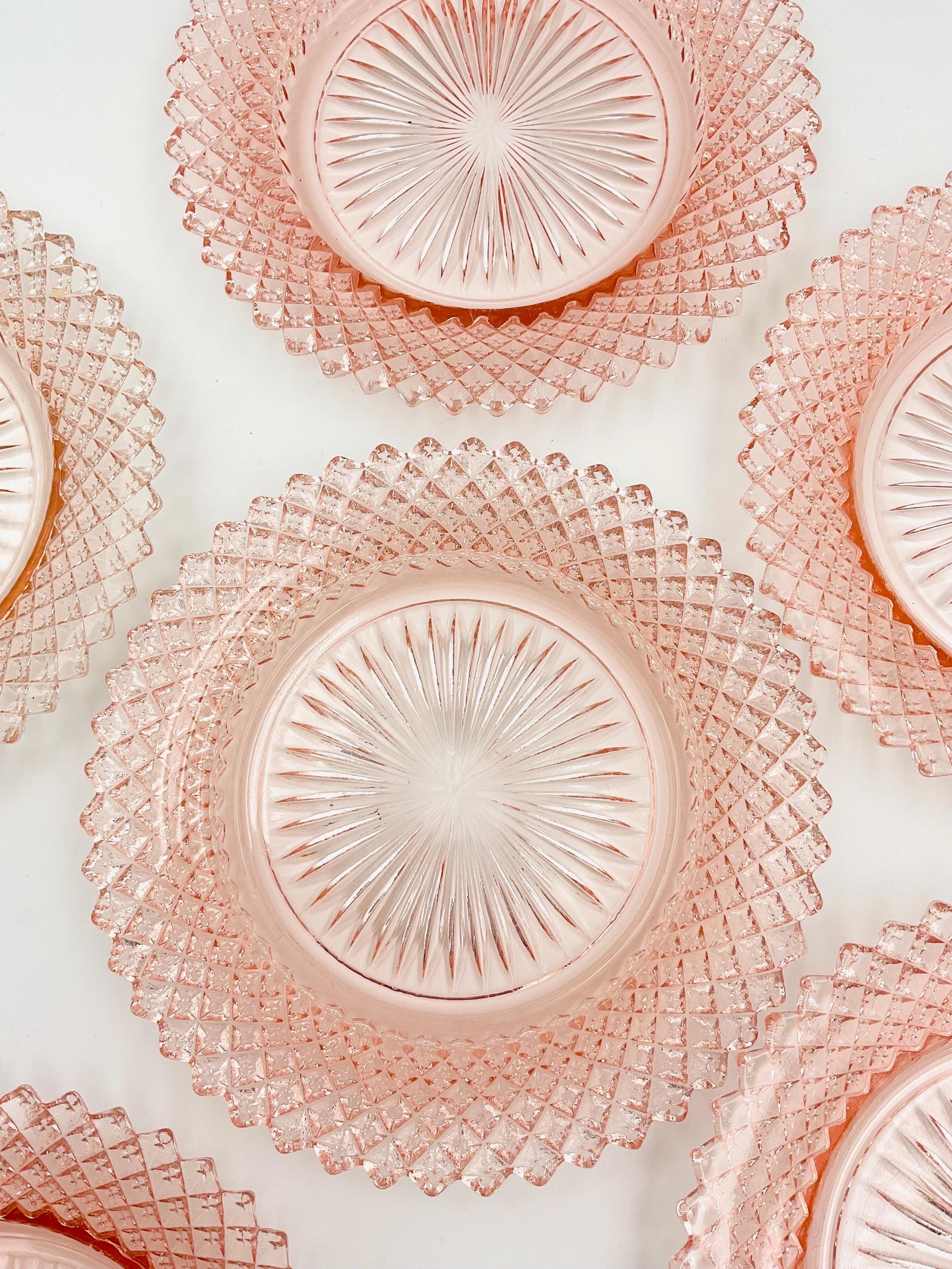 Vintage Anchor Hocking Miss American pink plate in the hobnail & ray design, produced between 1935 and 1938.