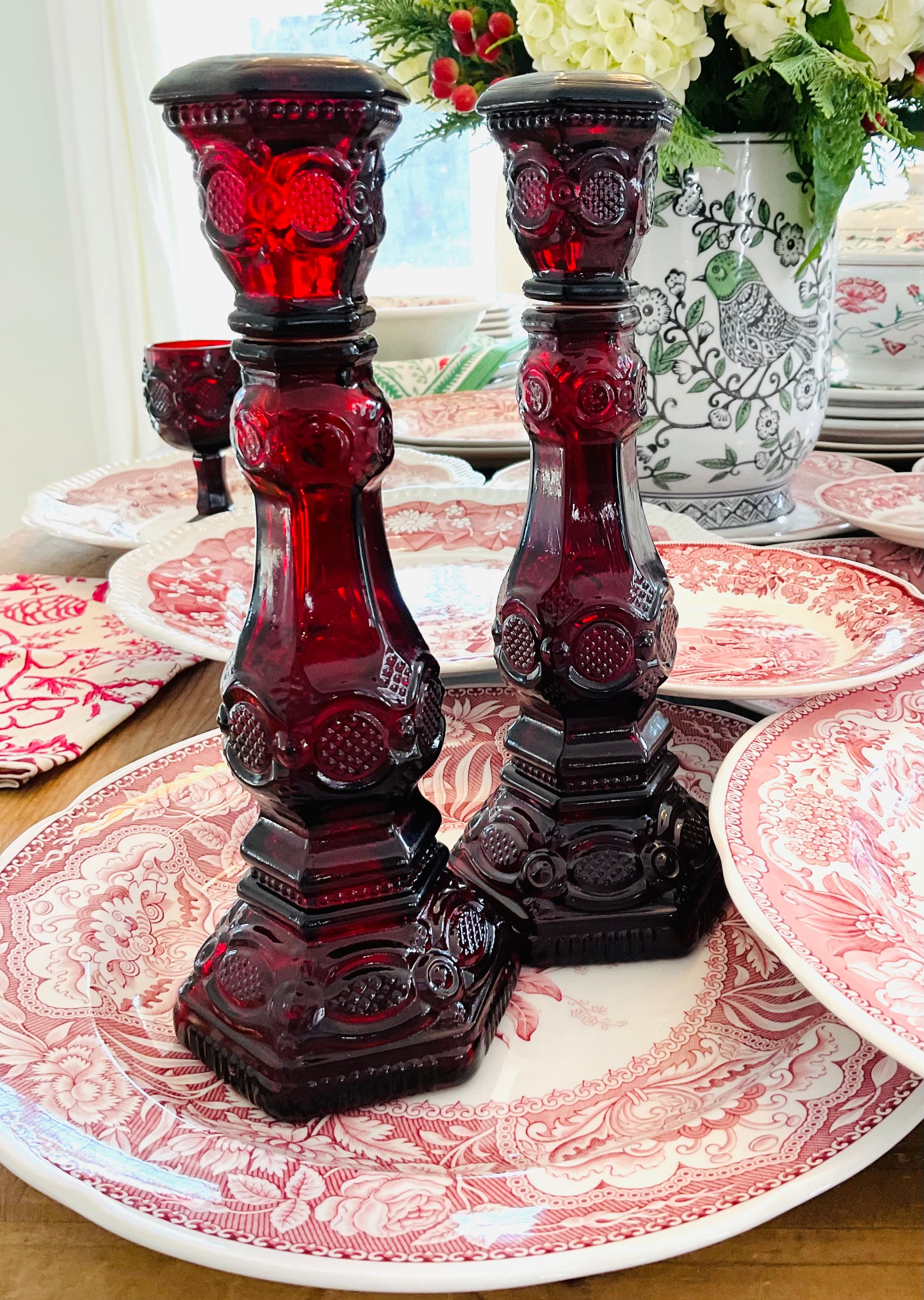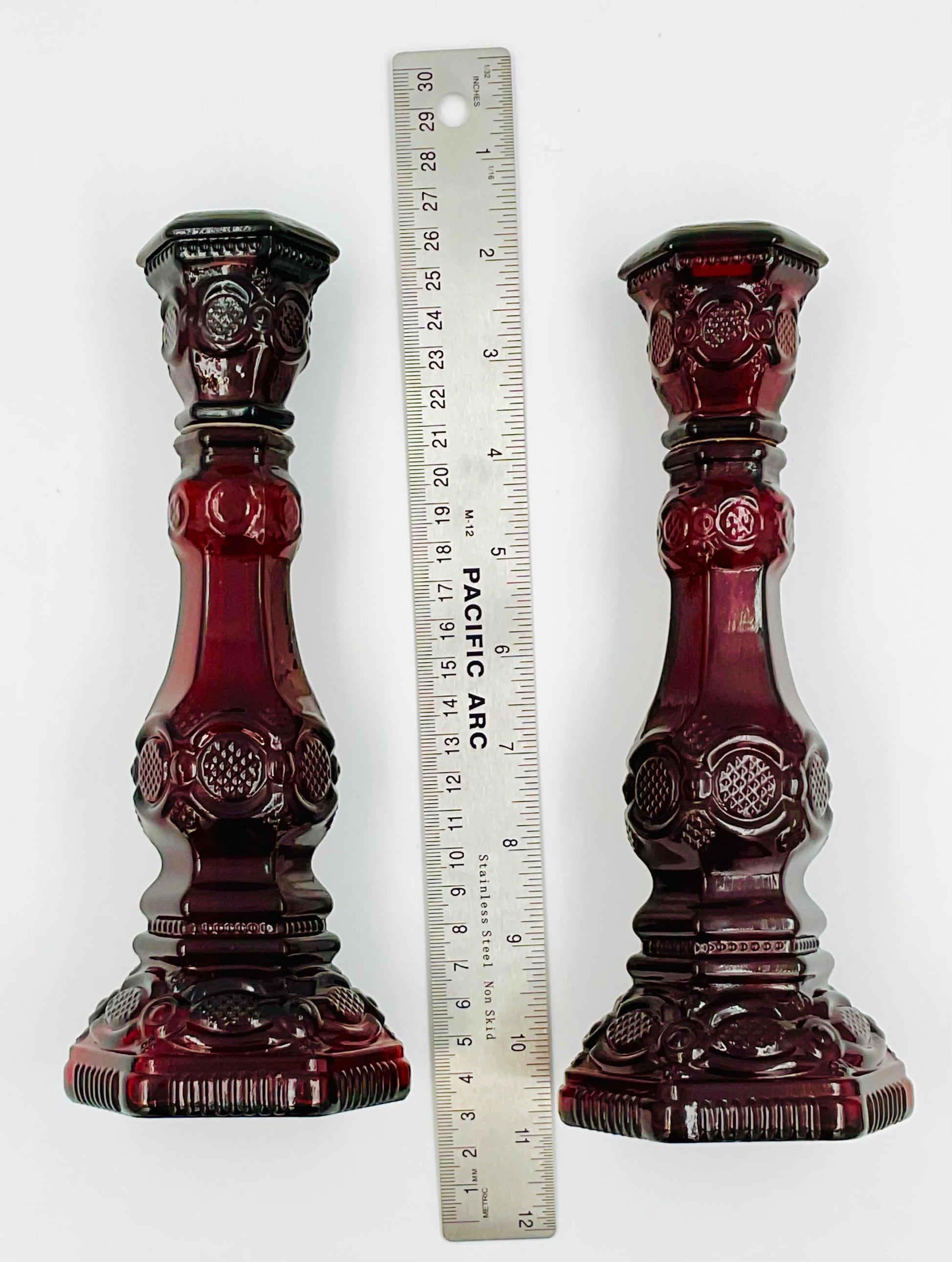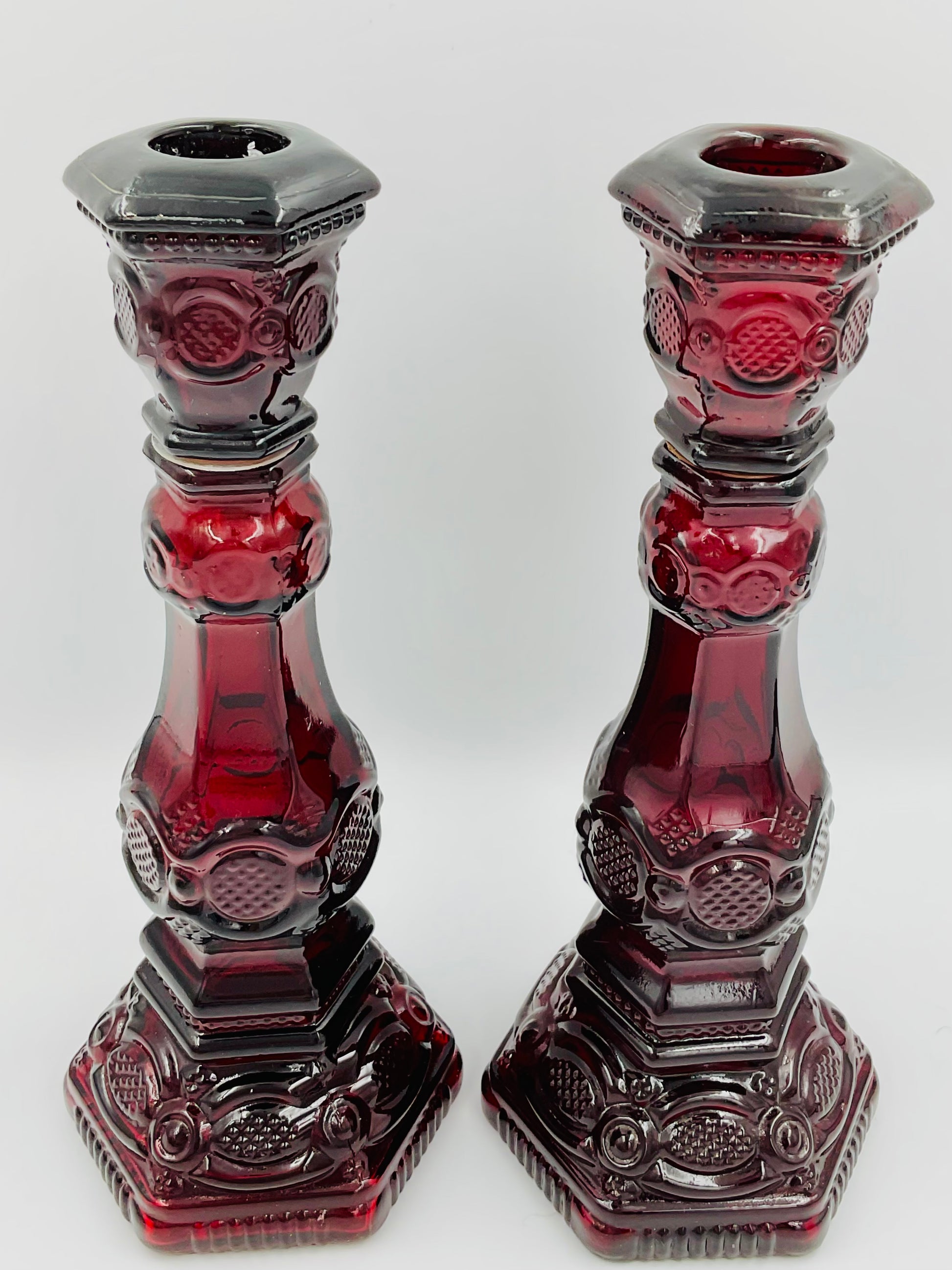 Vintage Avon 1876 Cape Cod Ruby Red Glass Candlestick Holder - Set of 2