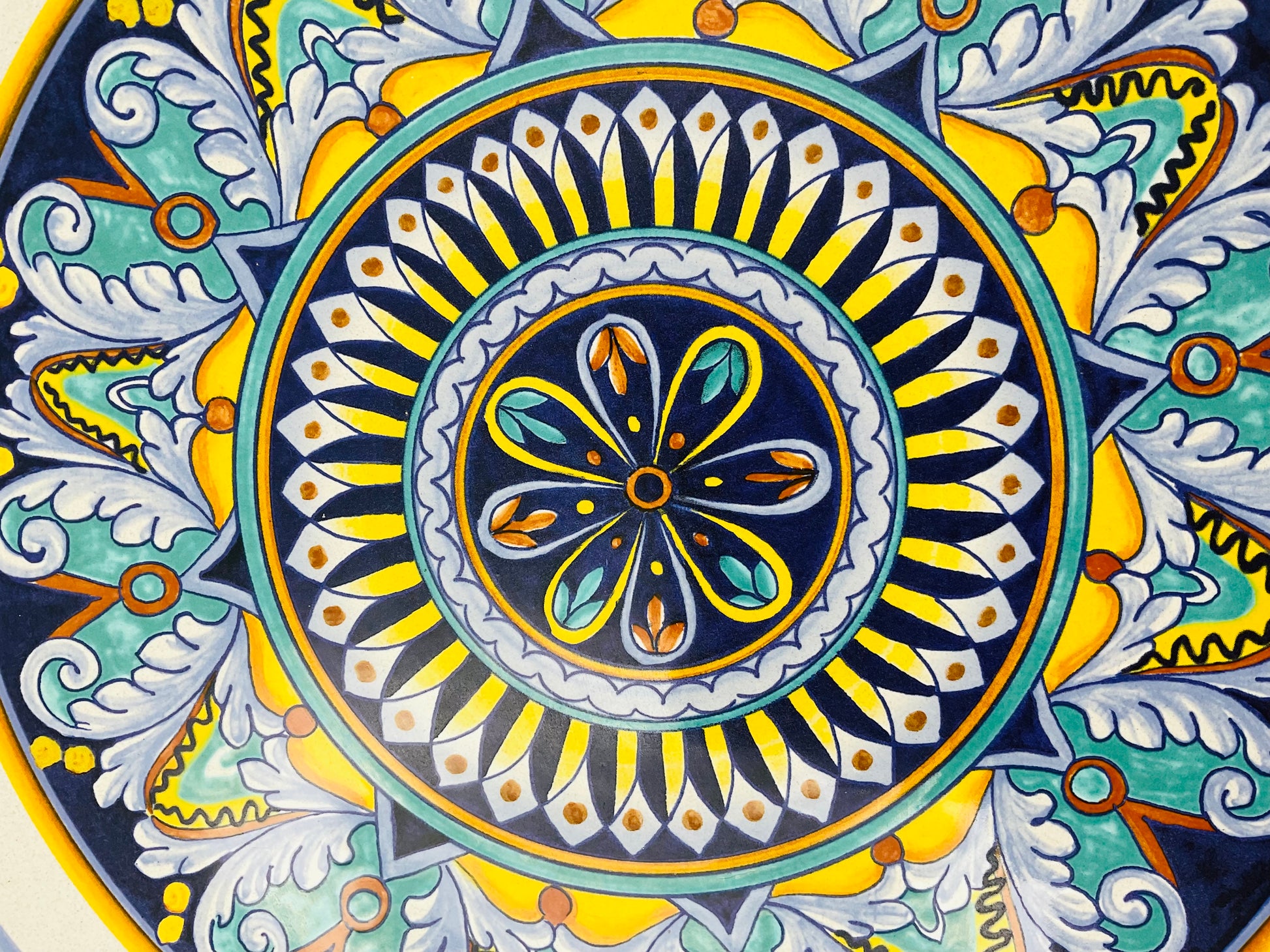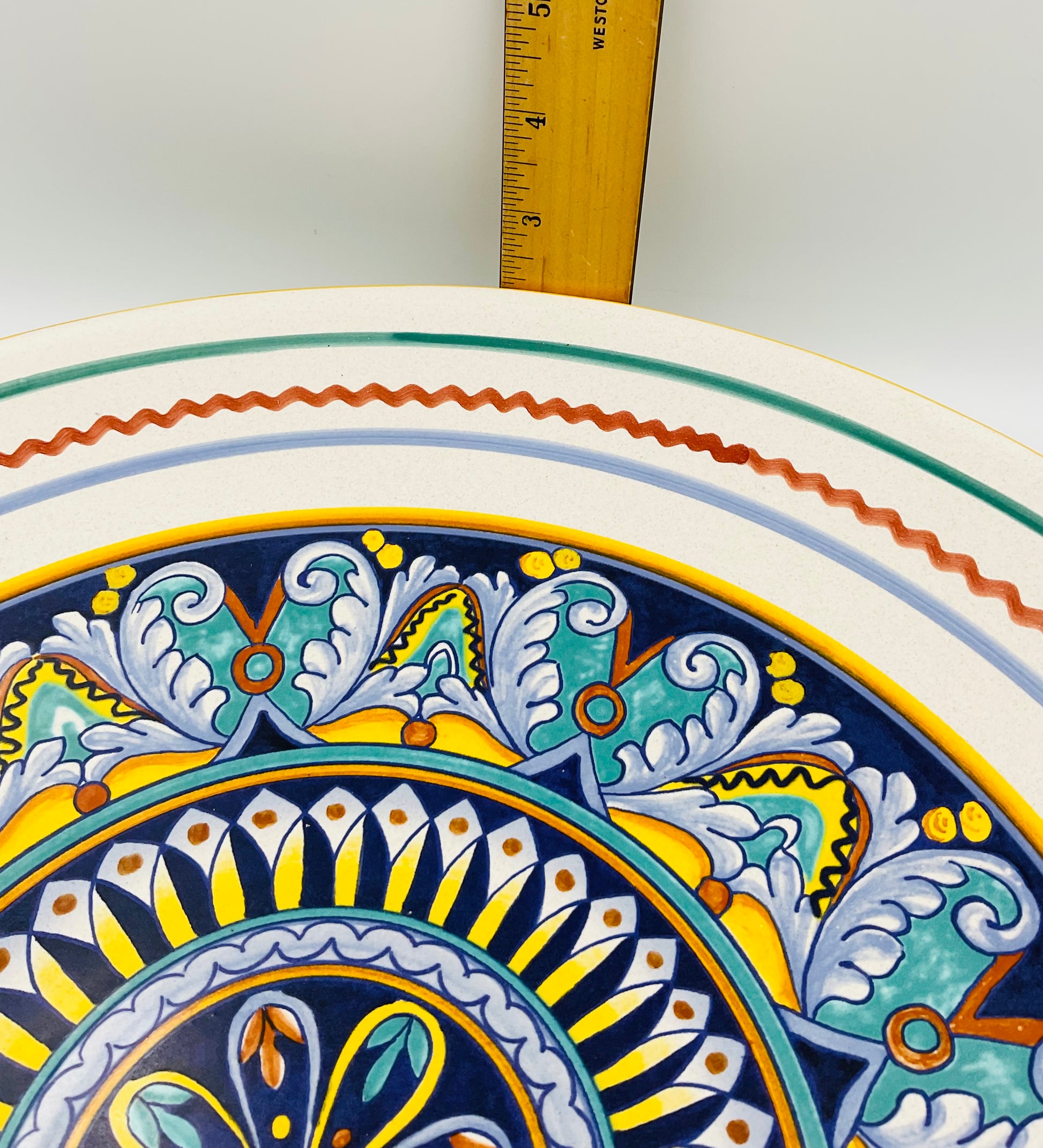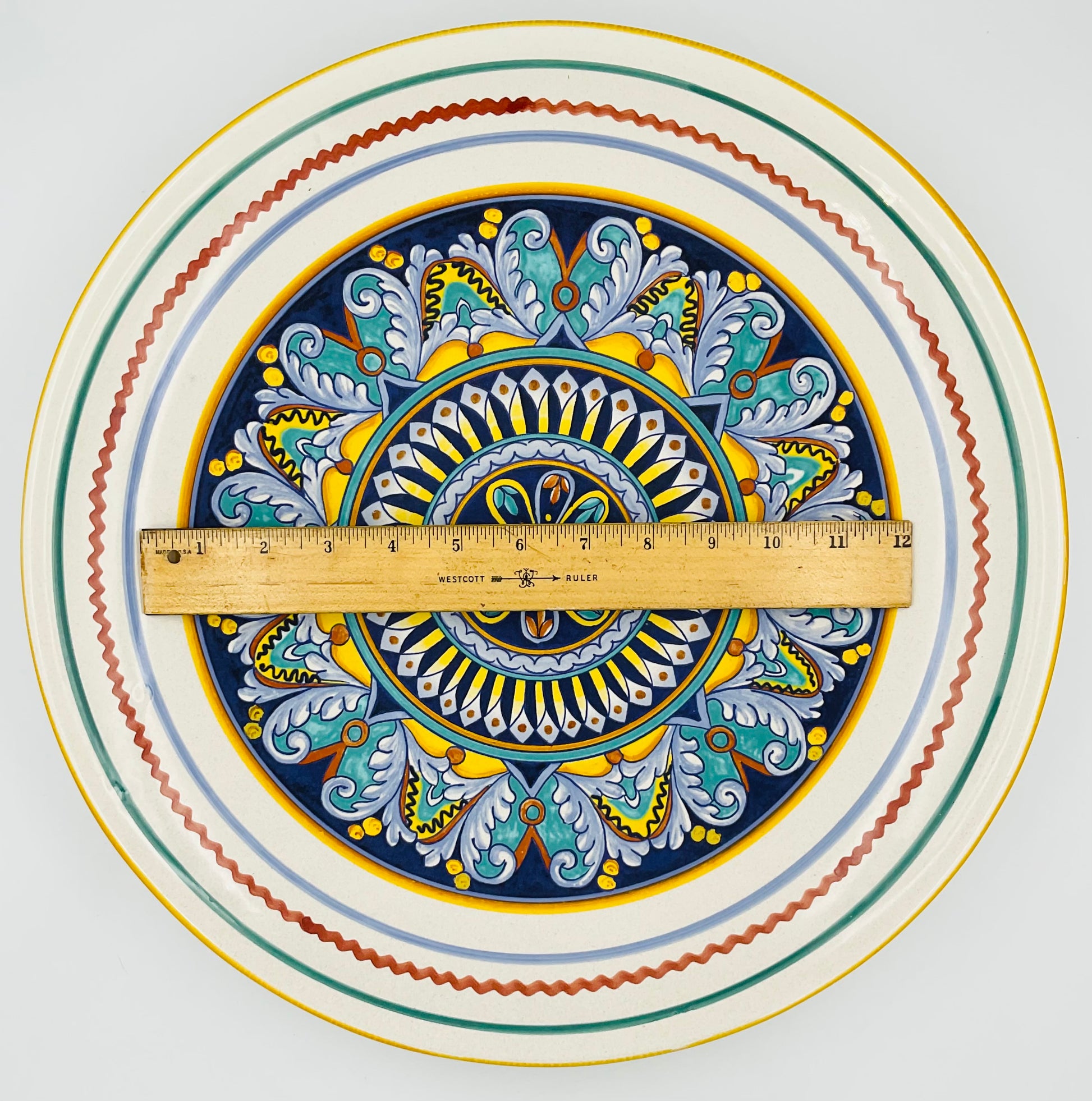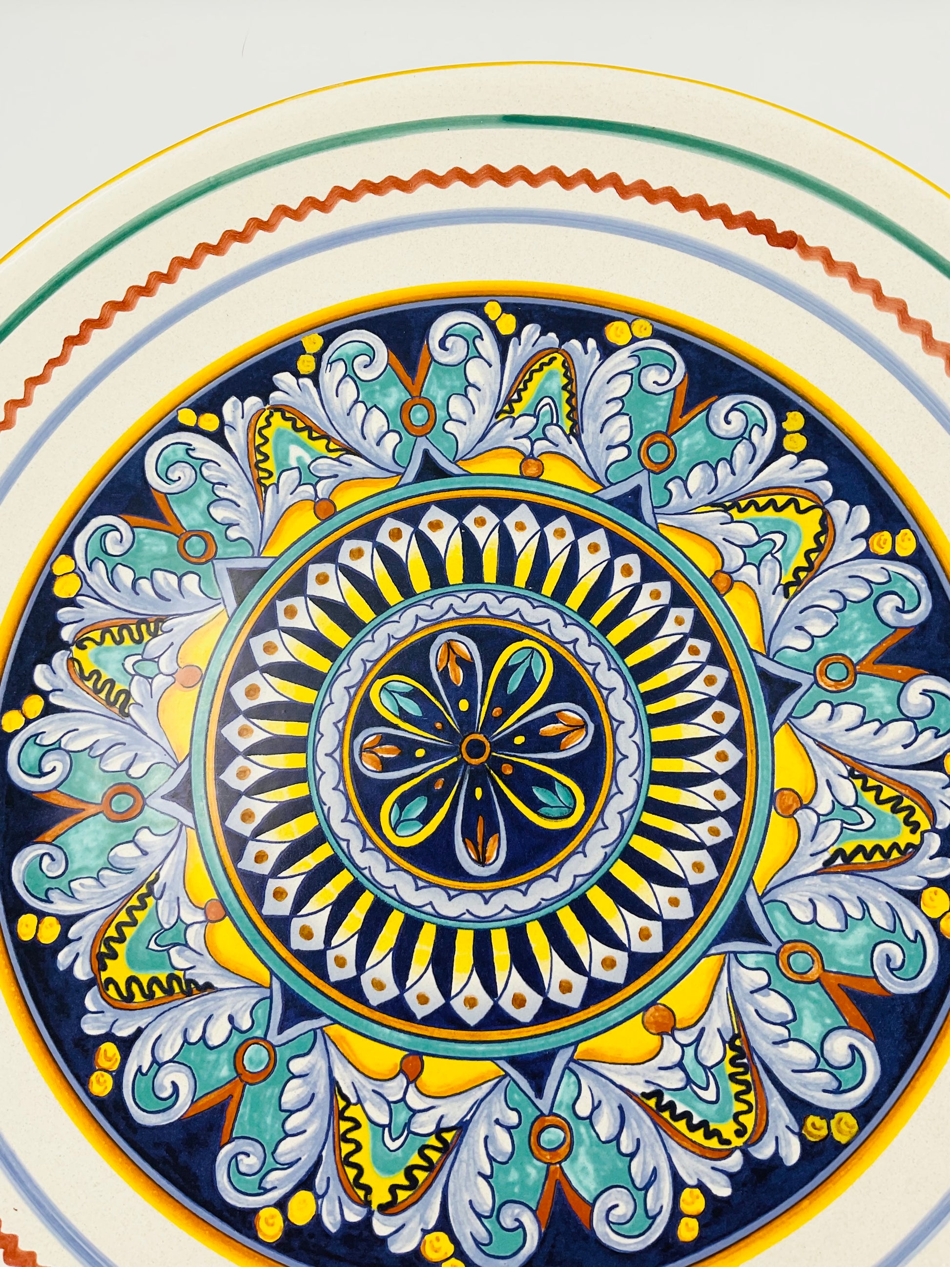 Deruta, a hilltop town in Umbria, Italy, has been the heart of Italian majolica pottery since the Renaissance. This vintage piece continues that centuries-old tradition of meticulous hand-painting, featuring the bold geometric patterns, layered medallions, and vibrant color palette that make Deruta ceramics instantly recognizable to collectors worldwide. Each brushstroke reveals the artisan's skill and the time-honored techniques passed down through generations.