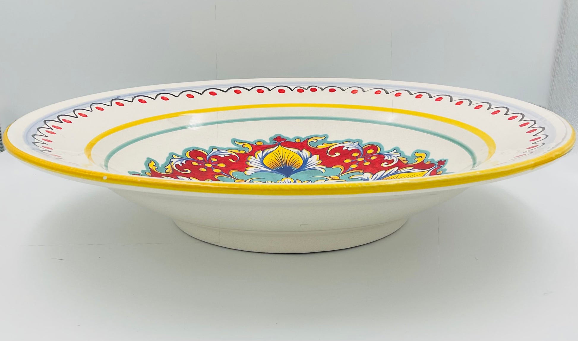 Bring the vibrant artistry of Italian majolica to your table with this exquisite hand-painted serving bowl from Ceramica Nova Deruta. The stunning Renaissance-inspired design features a central floral medallion in rich cobalt blue, golden yellow, turquoise, and crimson red, framed by concentric bands of yellow and teal with a charming scalloped rim adorned with red polka dots.