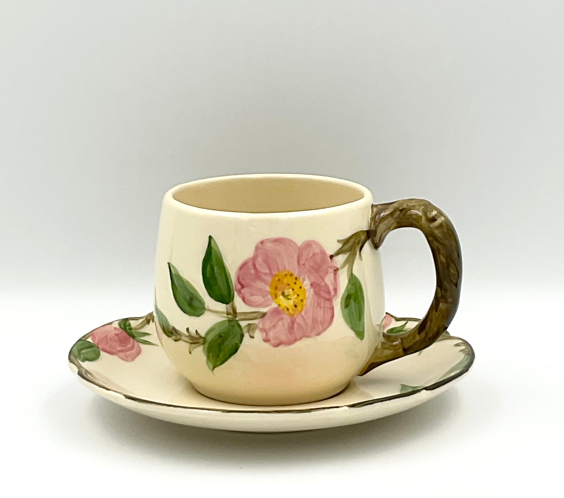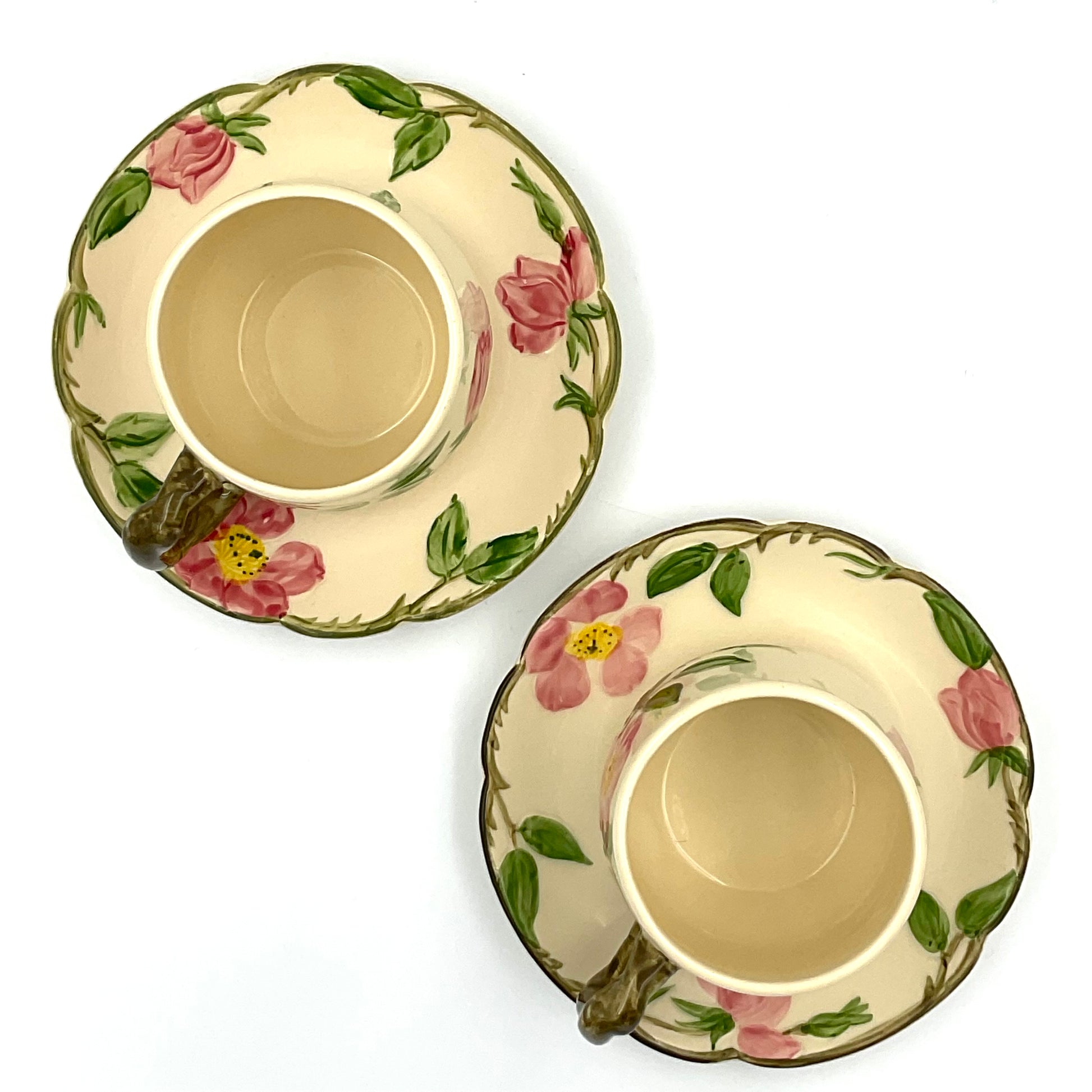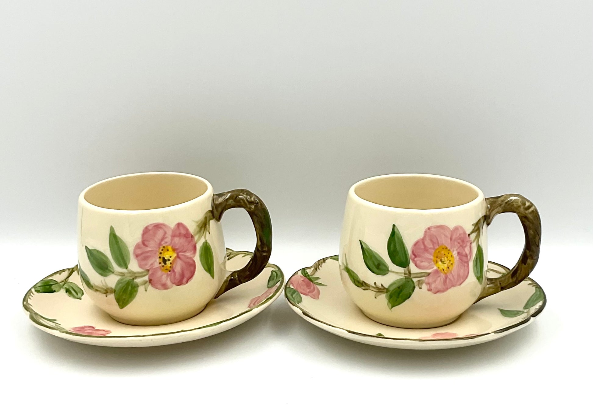 Franciscan's iconic Desert Rose pattern brings warmth and timeless elegance to any table. This set of four cups and saucers features the brand's signature hand-painted botanical motif—delicate rose blossoms and foliage rendered in soft, naturalistic tones. Crafted from durable ceramic with a smooth glaze finish, each piece showcases the quality and artistry Franciscan is known for. Perfect for everyday dining or special occasions, this vintage dinnerware set combines practical functionality with the refined aesthetic of mid-century American pottery. A cherished collectible for enthusiasts and a beautiful addition to traditional or eclectic table settings.