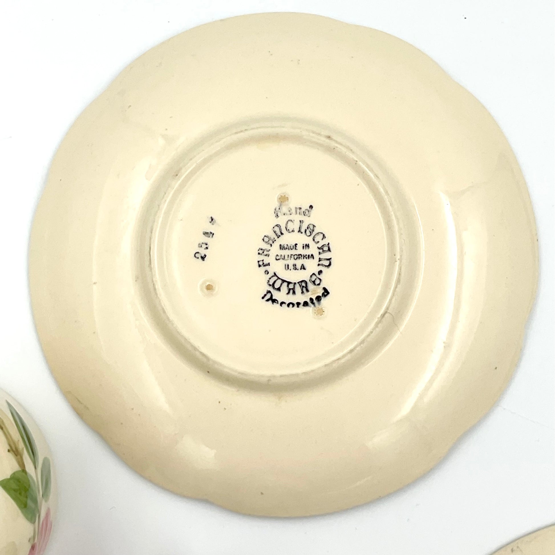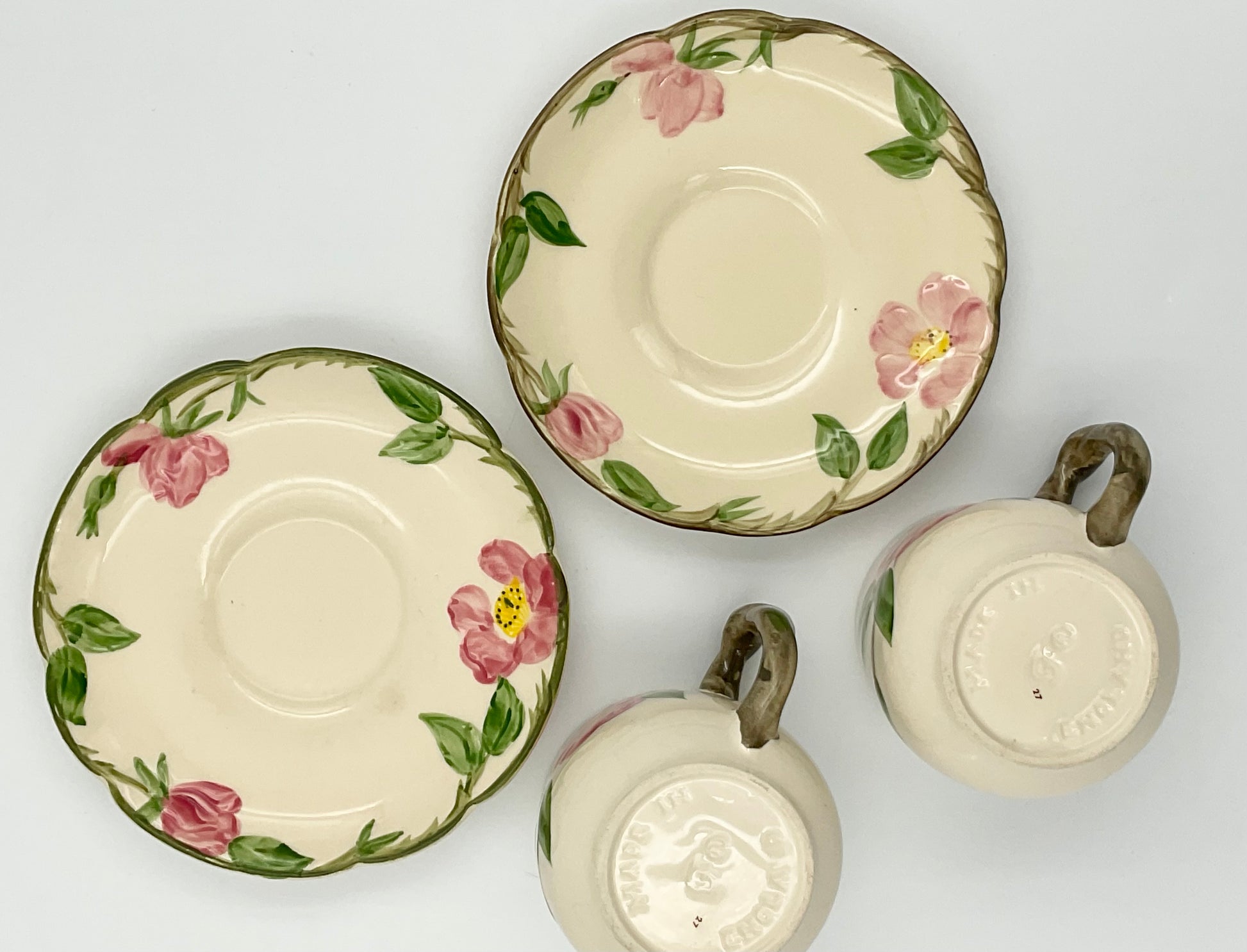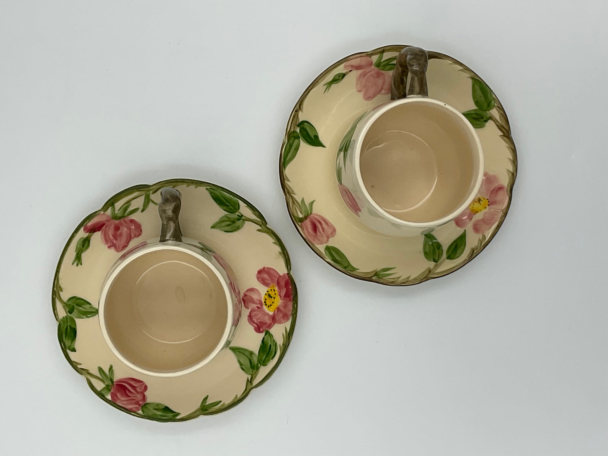 Franciscan's iconic Desert Rose pattern brings warmth and timeless elegance to any table. This set of four cups and saucers features the brand's signature hand-painted botanical motif—delicate rose blossoms and foliage rendered in soft, naturalistic tones. Crafted from durable ceramic with a smooth glaze finish, each piece showcases the quality and artistry Franciscan is known for. Perfect for everyday dining or special occasions, this vintage dinnerware set combines practical functionality with the refined aesthetic of mid-century American pottery. A cherished collectible for enthusiasts and a beautiful addition to traditional or eclectic table settings.