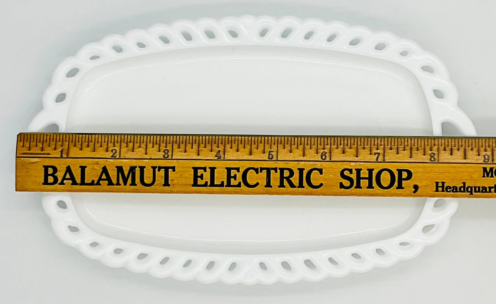 This elegant vintage Indiana Glass milk glass tray features the delicate Lace Edge pattern, adding a touch of romantic charm to your home. The intricate scalloped edges and pristine white glass create a timeless piece perfect for displaying jewelry, serving small treats, or adding cottage elegance to your vanity or dresser.