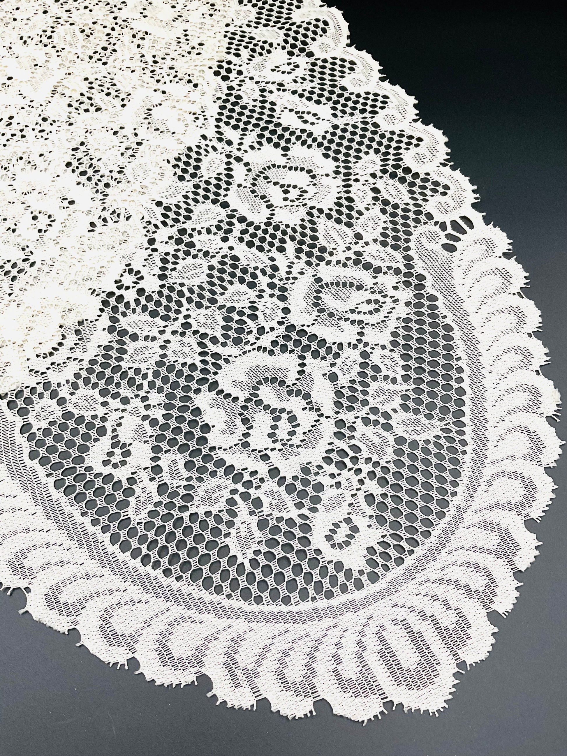 Drape your table in delicate nostalgia with this charming vintage lace runner. Intricate patterns and timeless elegance transform any dining surface into a showcase of refined style. Perfect for special occasions or everyday gatherings, this piece whispers stories of yesteryear while adding that coveted vintage touch to your home. A true collector's treasure that brings warmth and character to your décor.