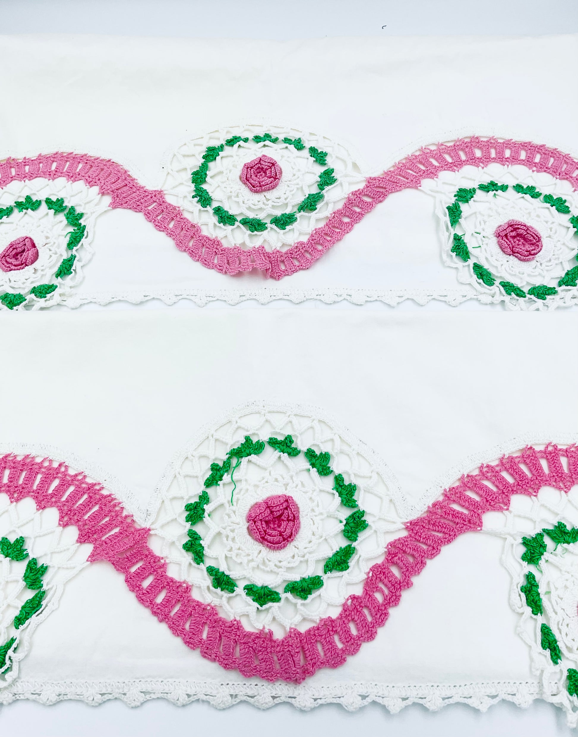 Vintage Pink & White Hand Crocheted Cotton Pillow Cases - Set of 2