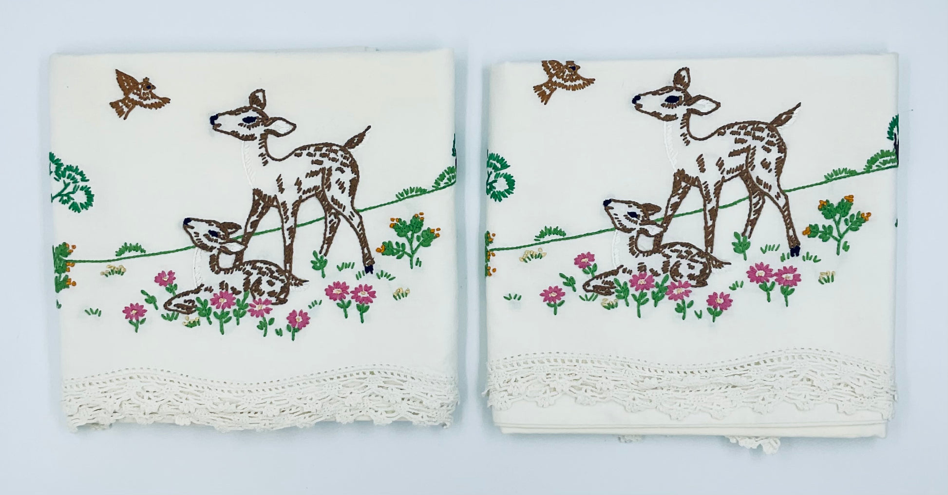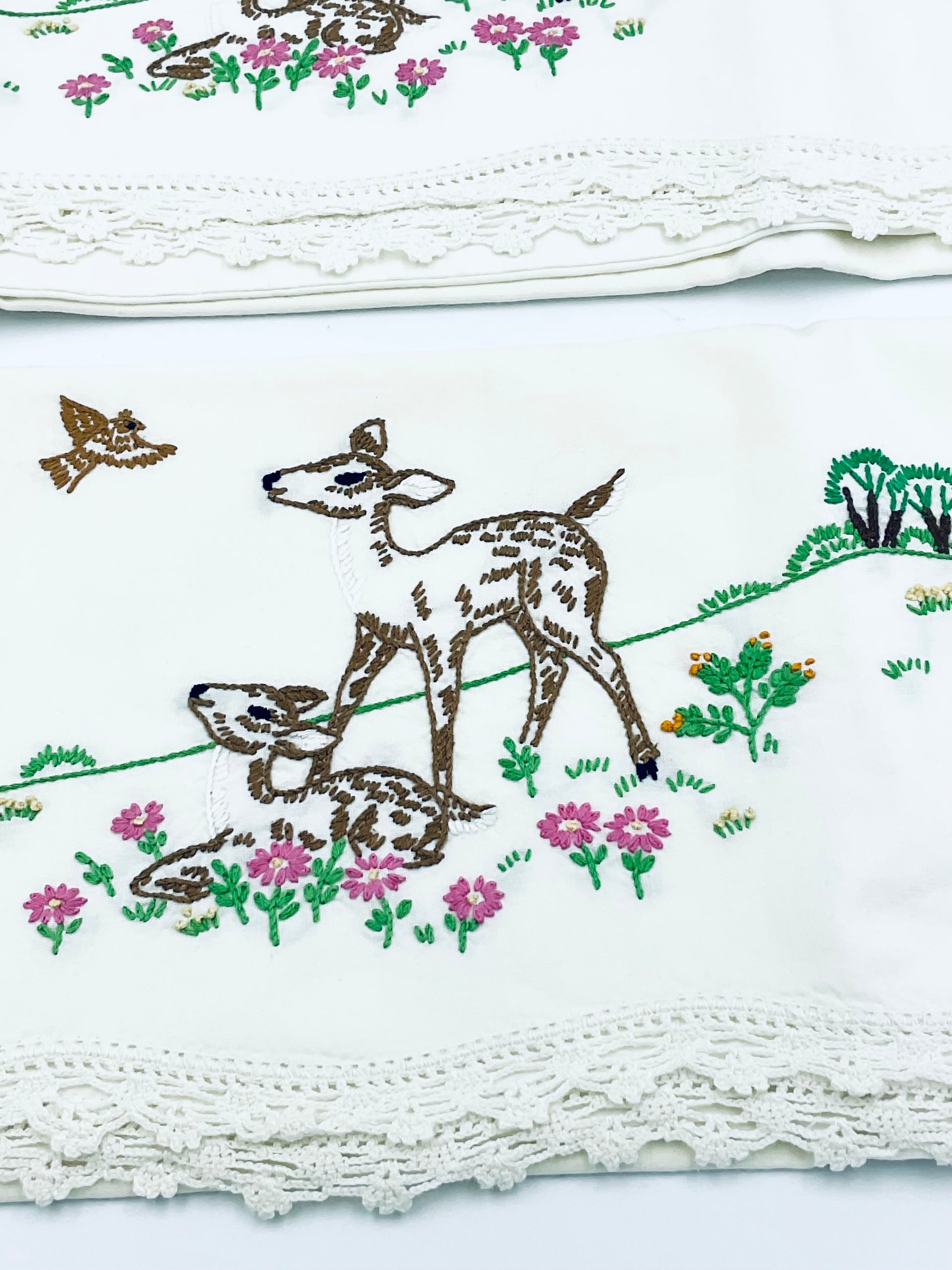 Vintage Hand Embroidered Deer Cotton Pillow Cases - Set of 2
