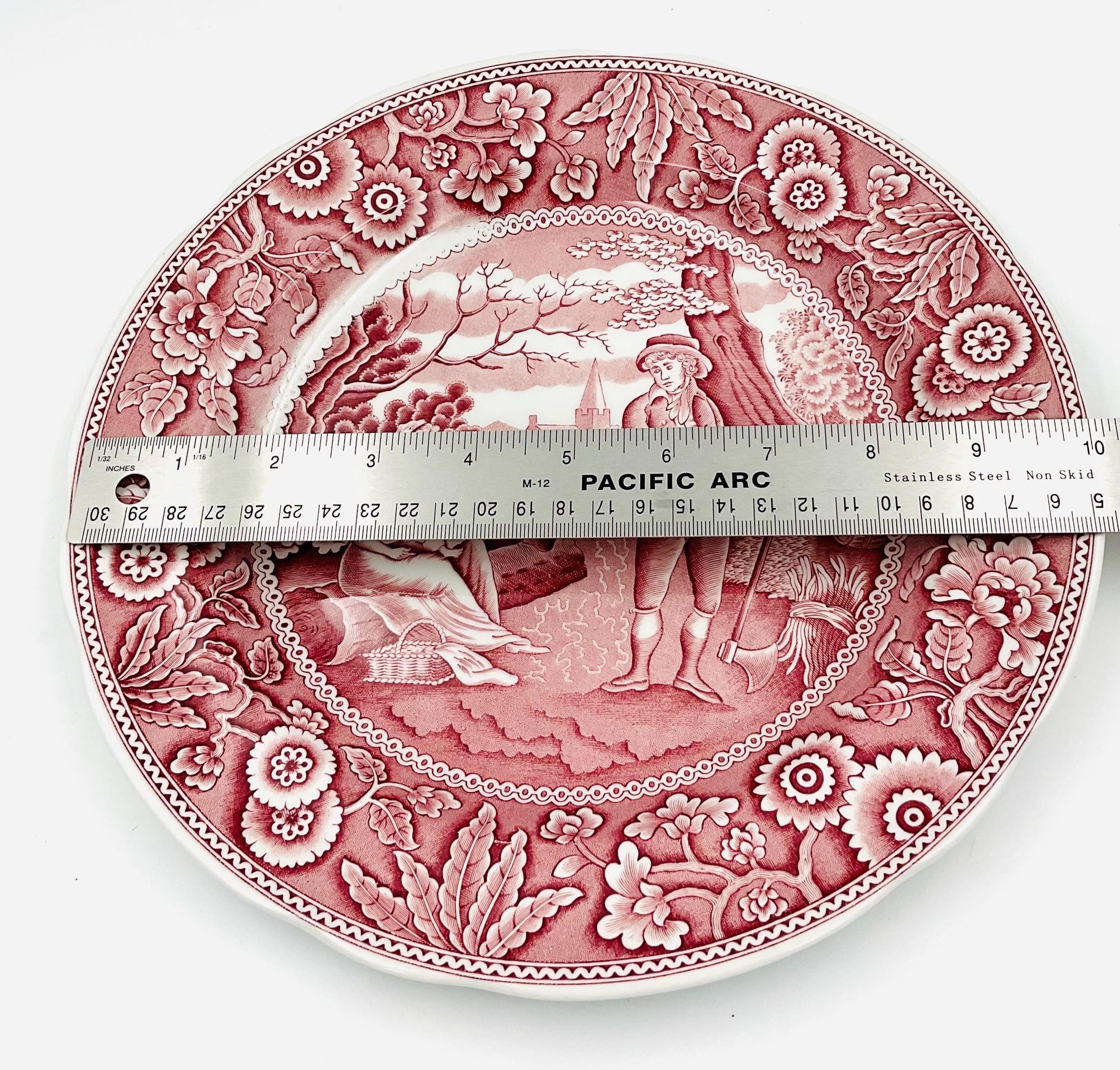 Vintage Spode Georgian Series ‘Woodman’ Archive Collection Plate in the red/cranberry/pink transferware design. Inspired by antique engravings and bordered with traditional motifs. Made in England.