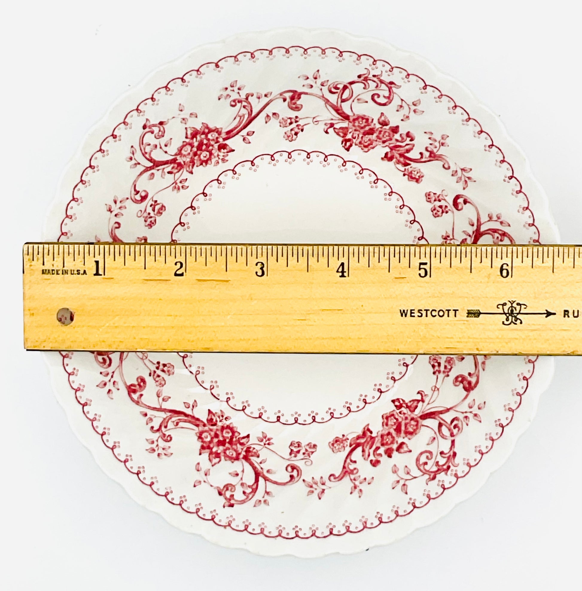 The Regency pattern showcases graceful flowering vines and scrolls arranged in concentric bands, framed by an elegant scalloped edge with beaded detailing. The soft red-pink colorway brings warmth and vintage charm to any table setting.