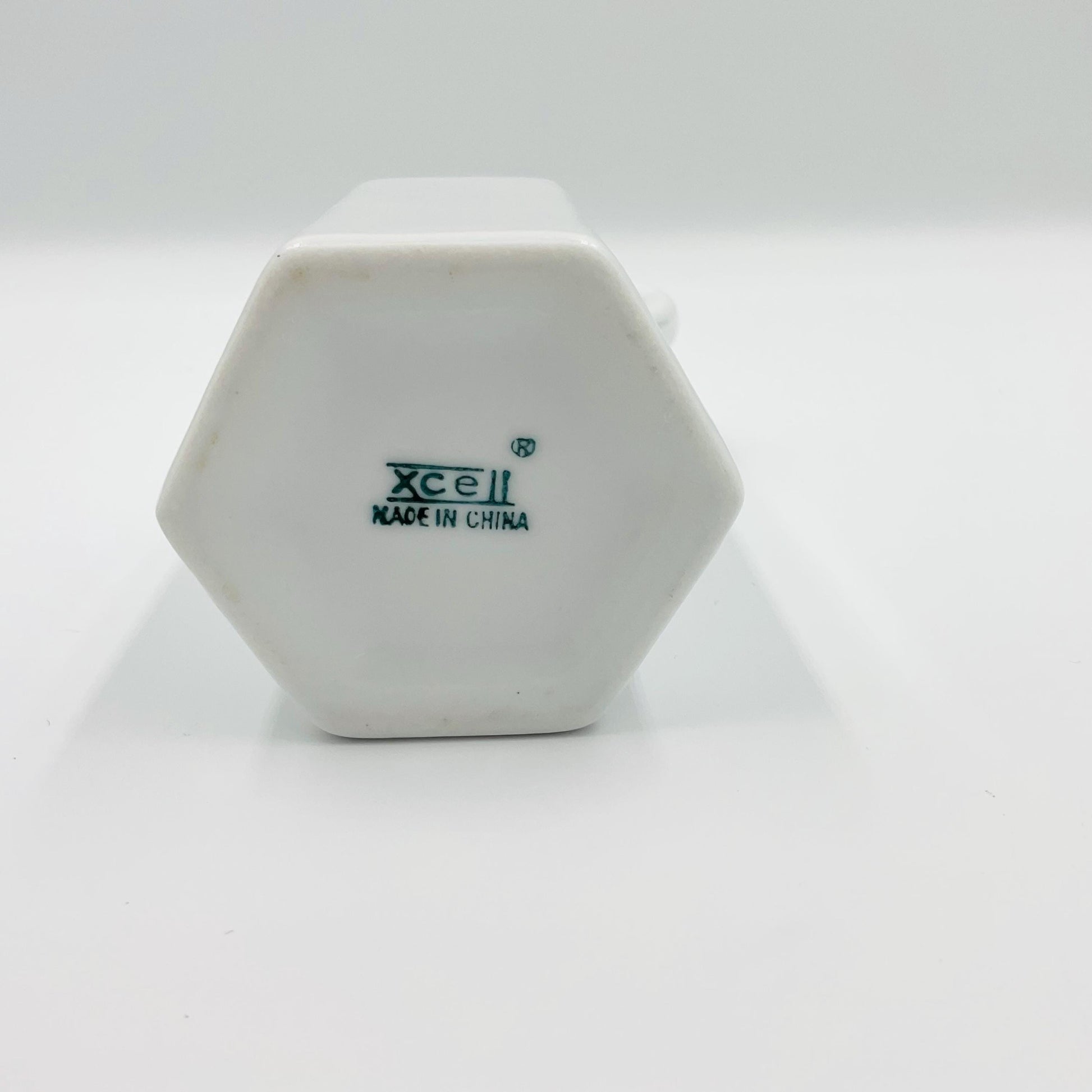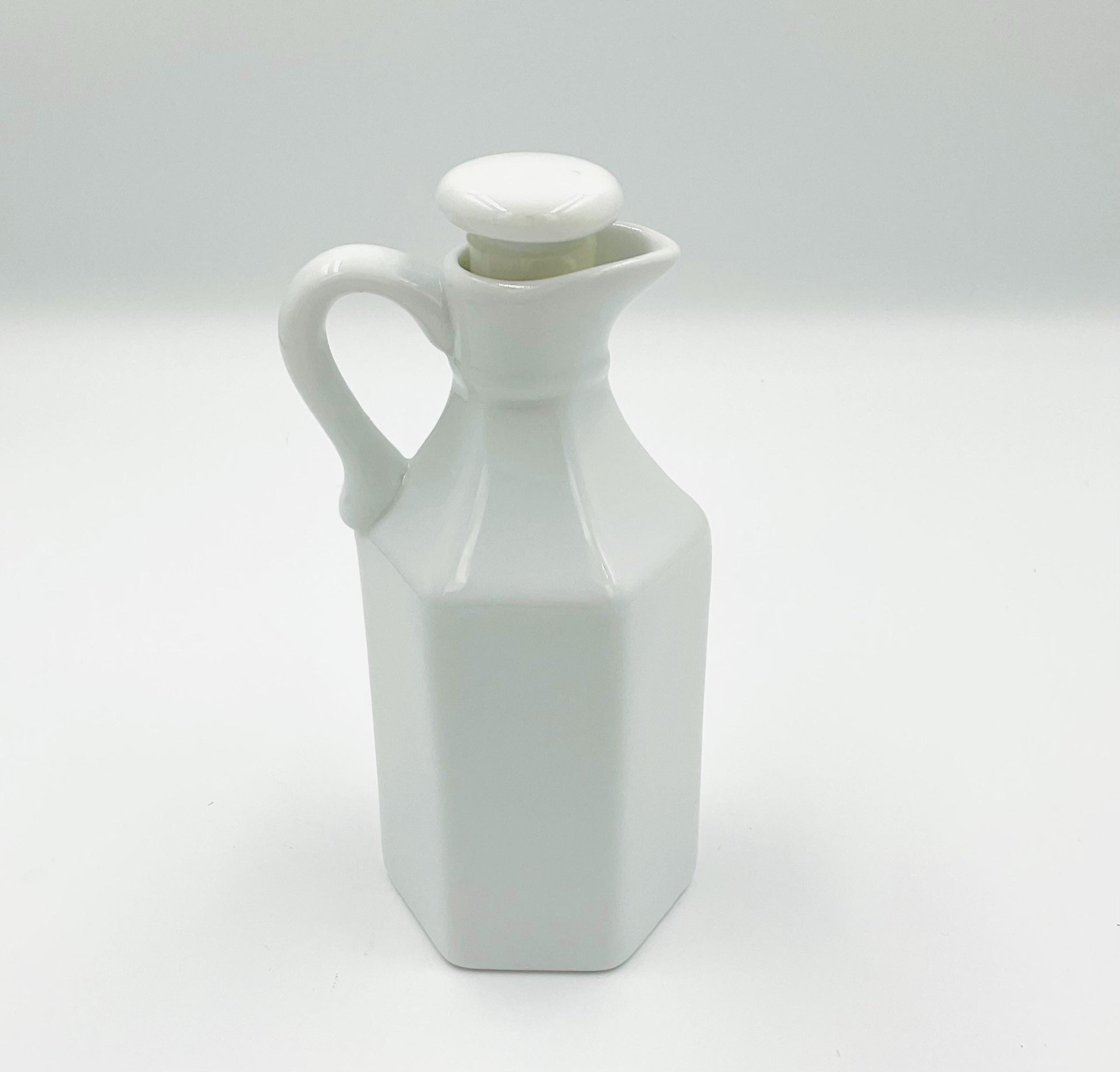 This is a vintage XCell White Ceramic 6-Sided Oil or Vinegar Cruet with a stopper.