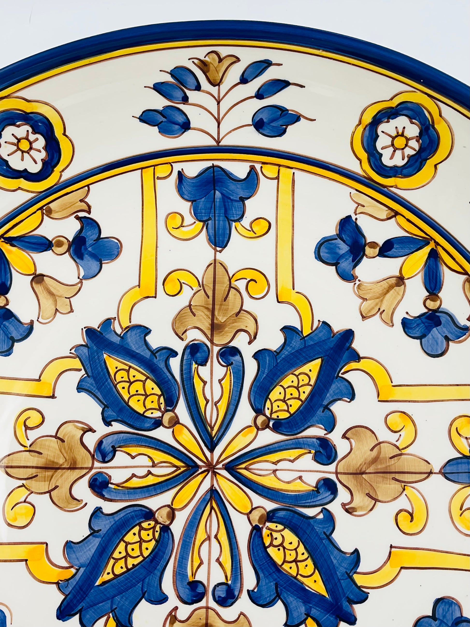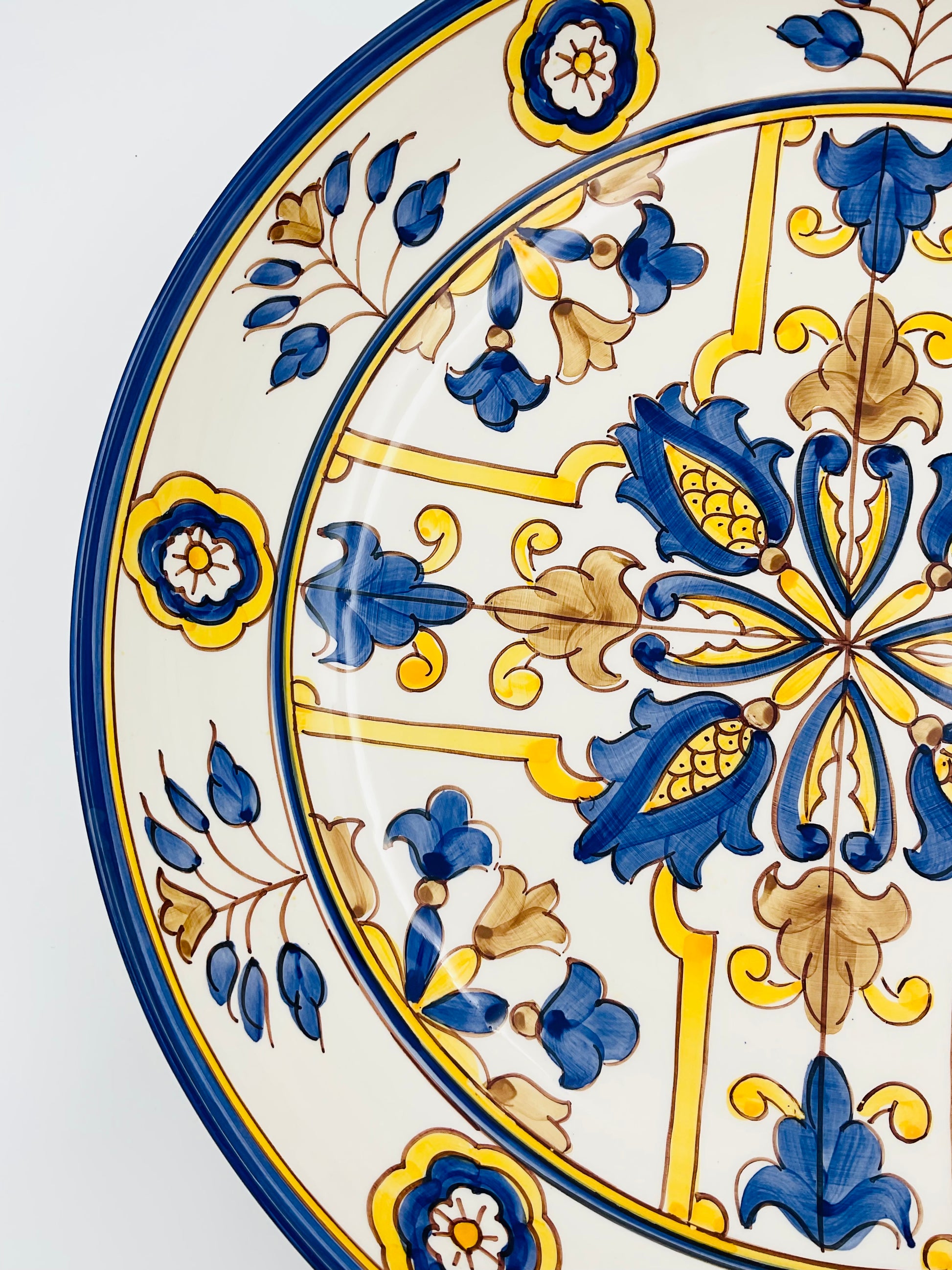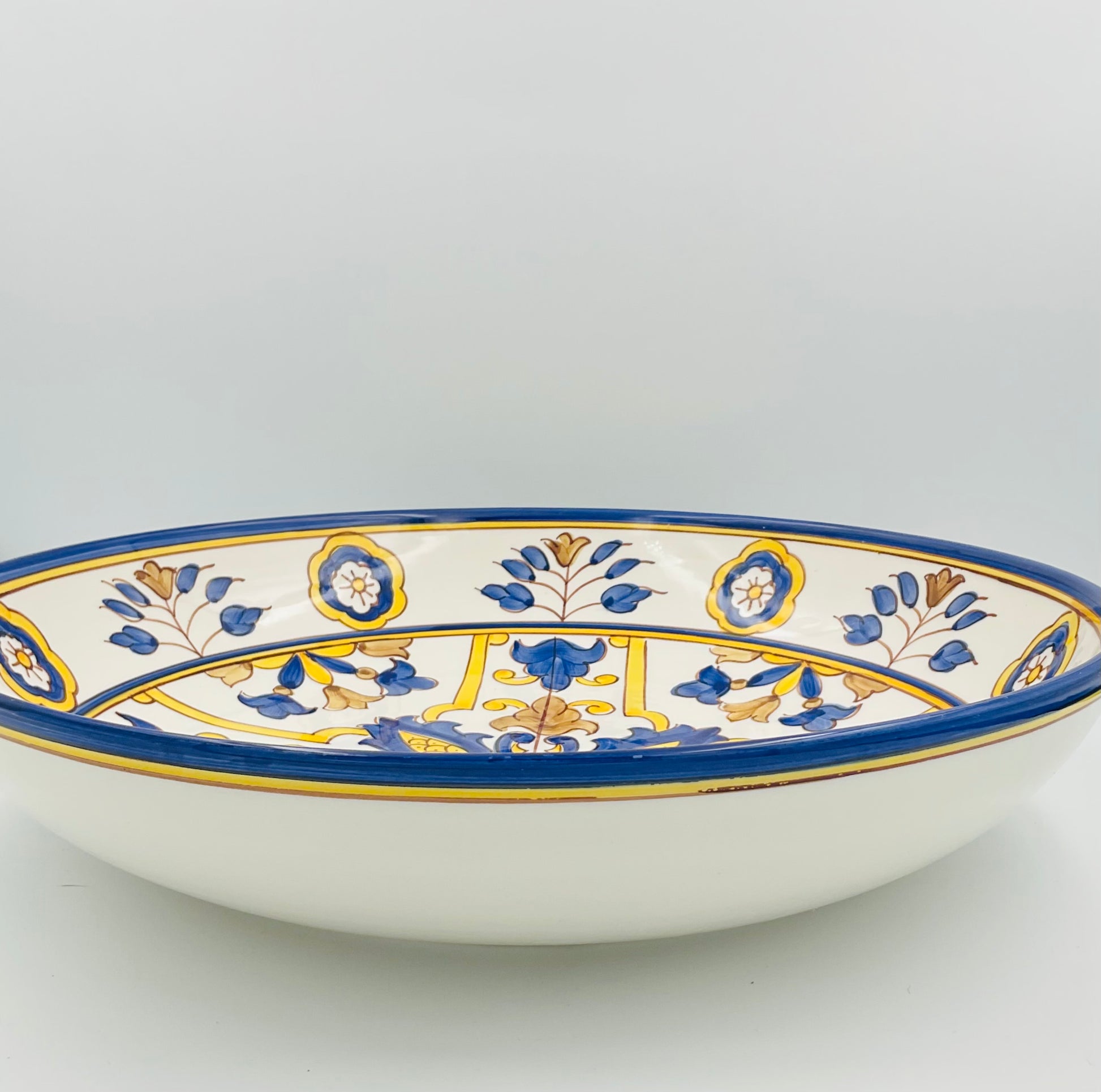 Elevate your table with this exquisite hand-painted serving bowl from Williams Sonoma's celebrated Nazari collection. Inspired by traditional Italian majolica artistry, this stunning piece features an intricate floral medallion in rich cobalt blue and golden yellow, framed by delicate botanical motifs and geometric borders that showcase the artisan's meticulous brushwork.